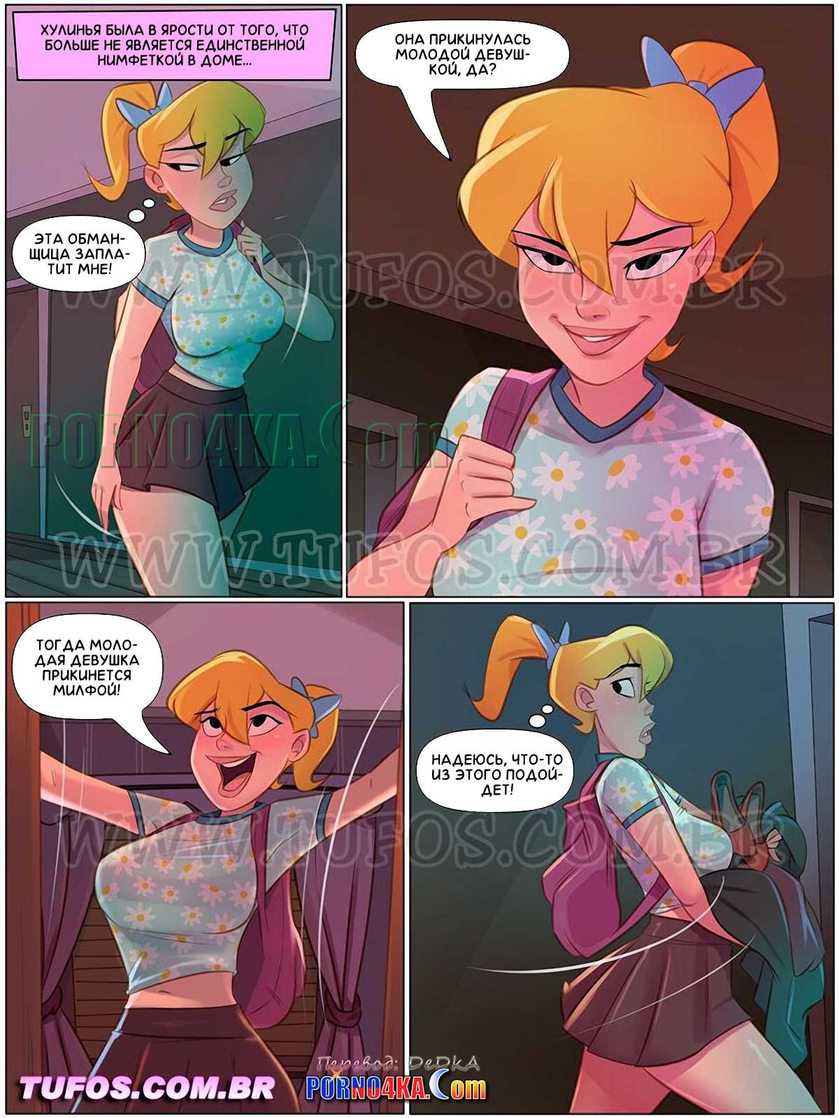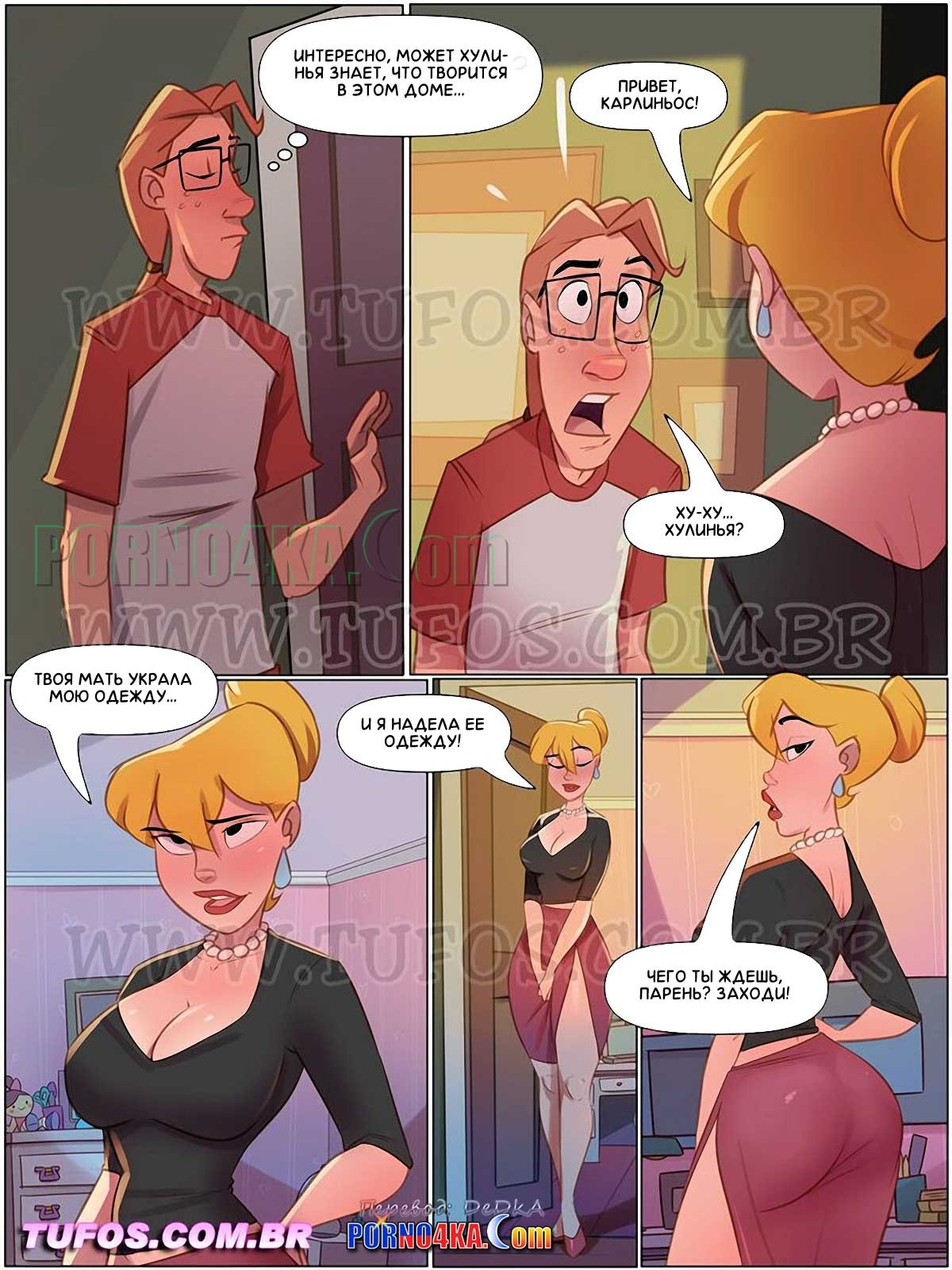 Секс комикс Четверо похотливых. Часть 9: Подмена. Эпизод 2. Хулинья только что застала дону Марию в одежде нимфетки… Разозлившись, девушка крадет несколько предметов одежды доны Марии. Одевшись, как горячая милфа, она ждет прихода Карлиньоса, чтобы проверить соблазнительную силу зрелой знойной женщины…