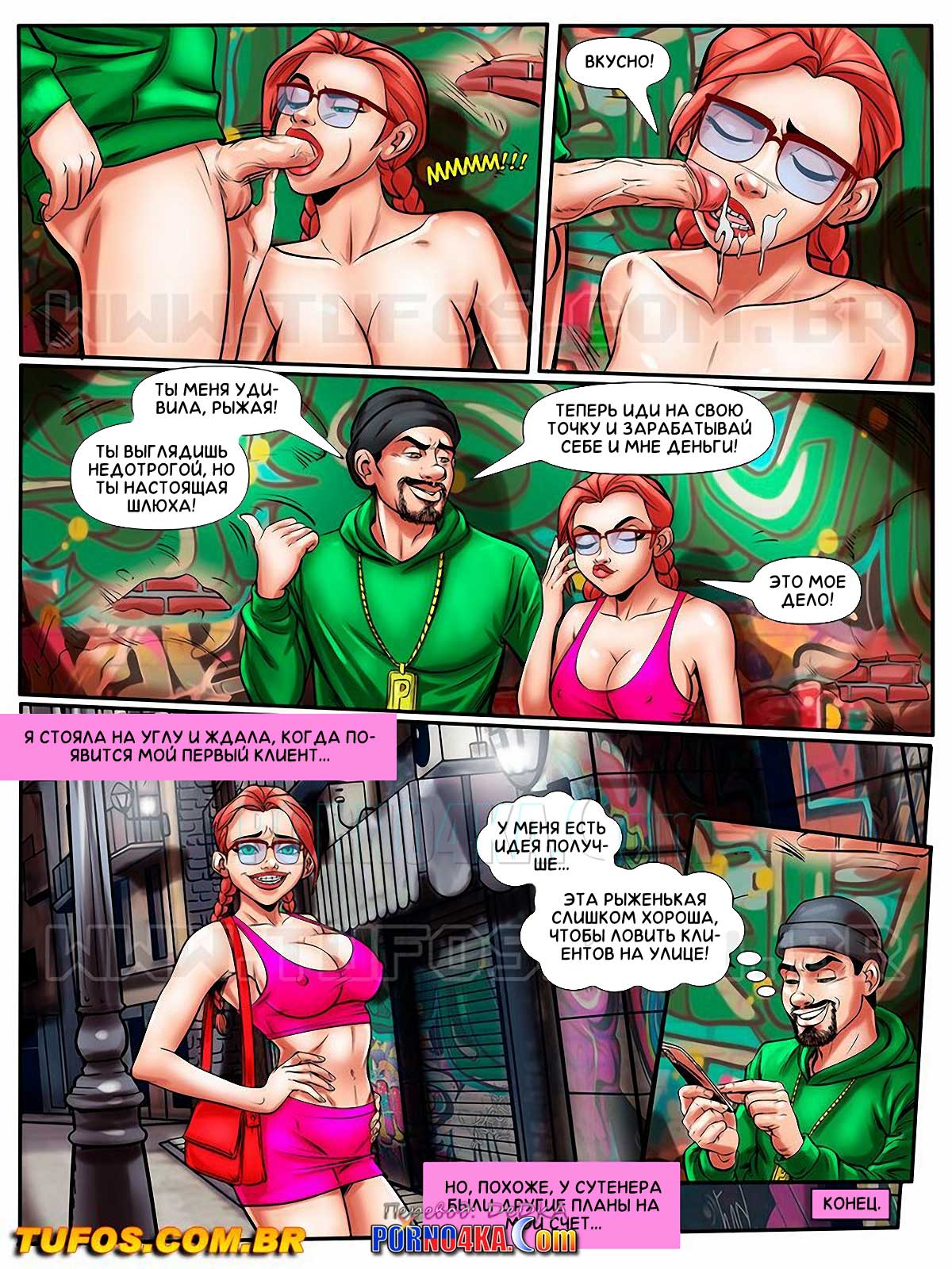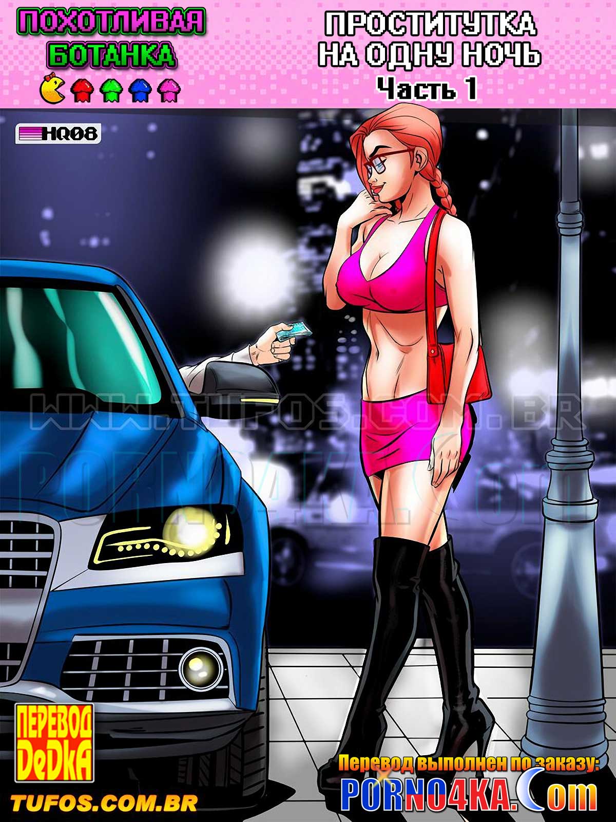 Секс комикс Похотливая ботанка. Часть 8: Проститутка на одну ночь. Эпизод 1. Опыт секса с незнакомцами очень понравился Эмме, поэтому следующим вечером девушка вновь готова пойти дальше! Одев на себя очень короткую юбку и кожаные сапоги, озабоченная ботанка отправляется в район, где работают уличные проститутки… Но жизнь уличной шлюхи совсем нелегка. И вскоре появляется так называемая «крыша», чтобы забрать свою «дань» с ночных бабочек…