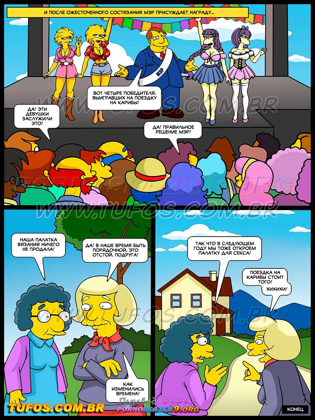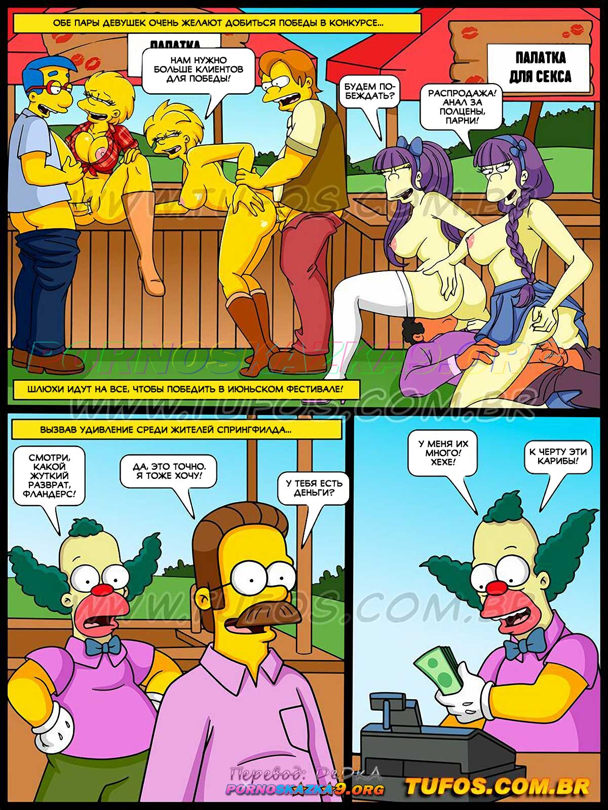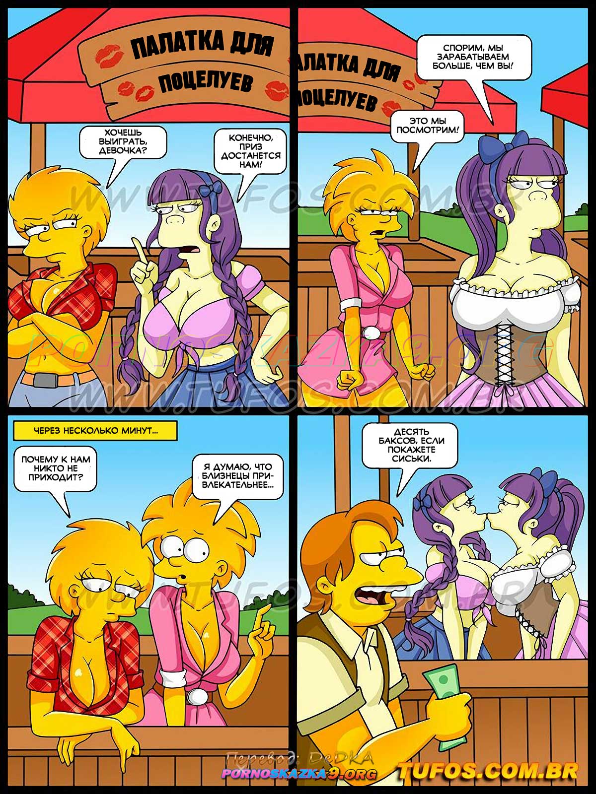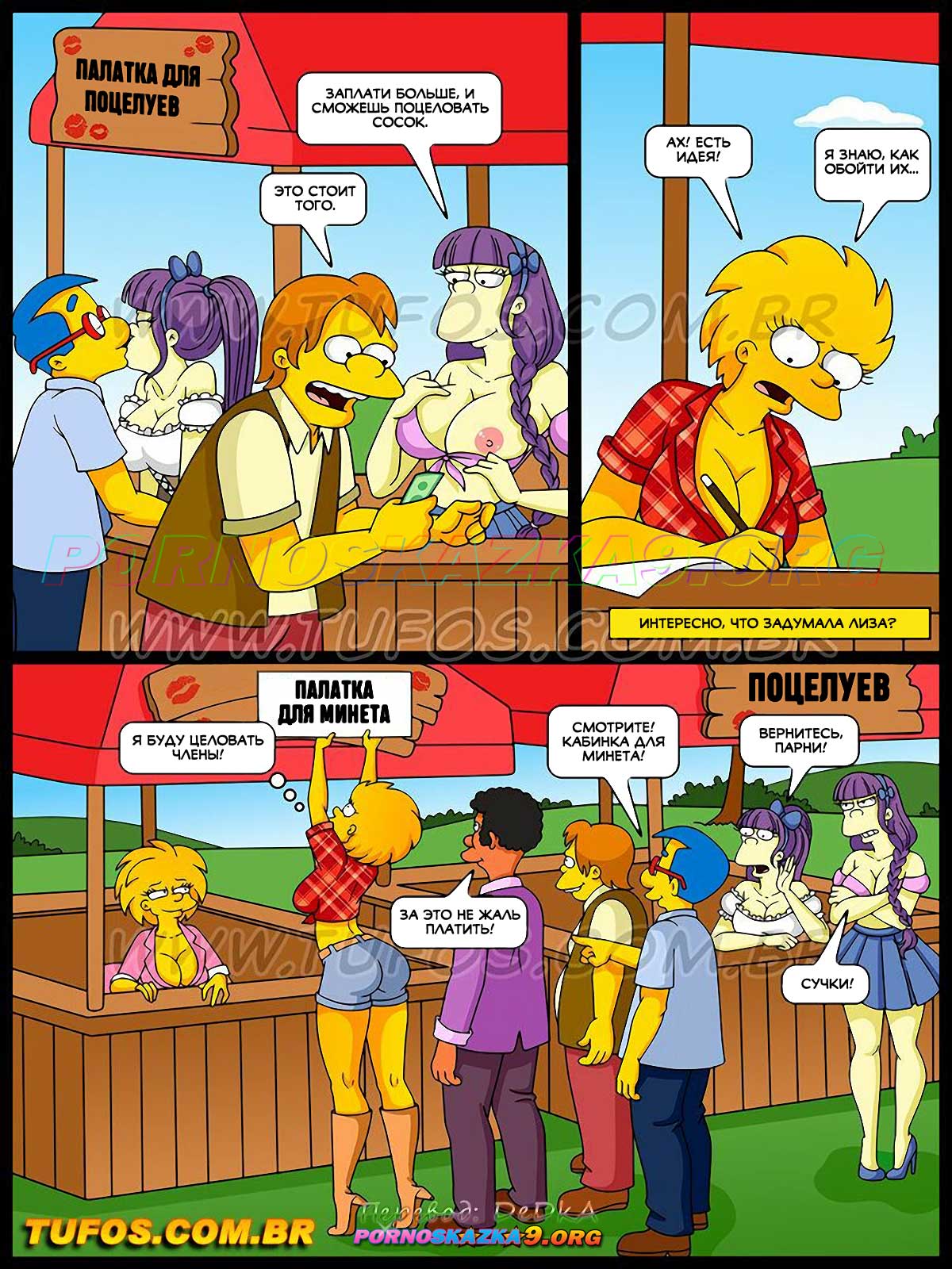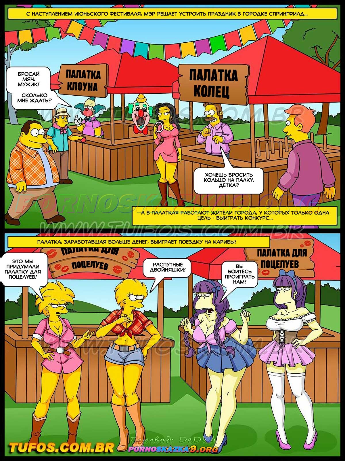 Секс комикс Симпсоны. Часть 43. Палатка для секса. Спрингфилдский июньский фестиваль продолжается! Мэр города обещает наградить хозяев палатки, которая соберет больше всего денег, поездкой на Карибы… Мэгги и Лиза в палатке поцелуев надеются получить приз.