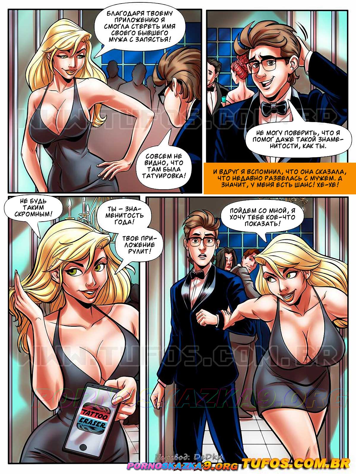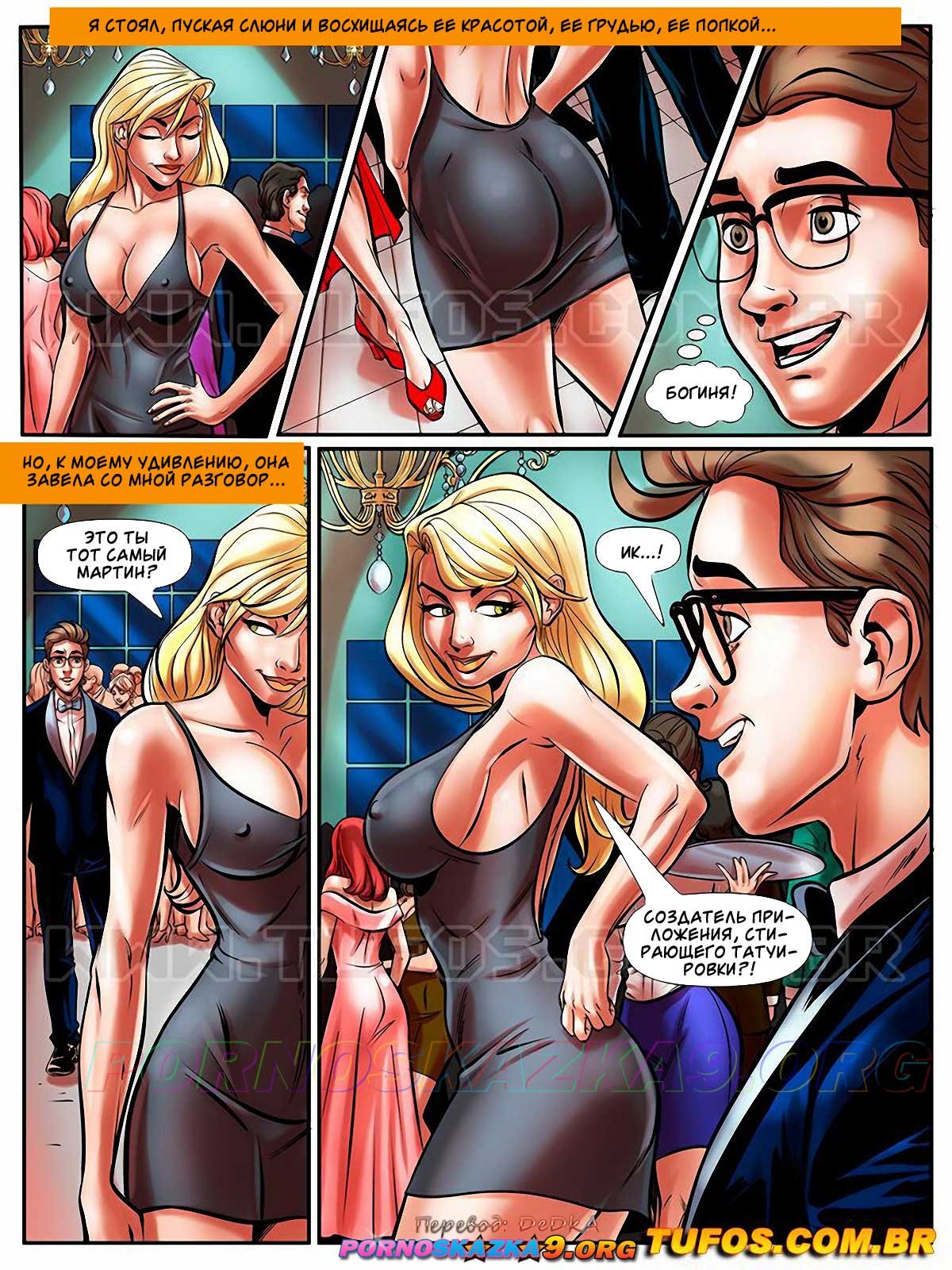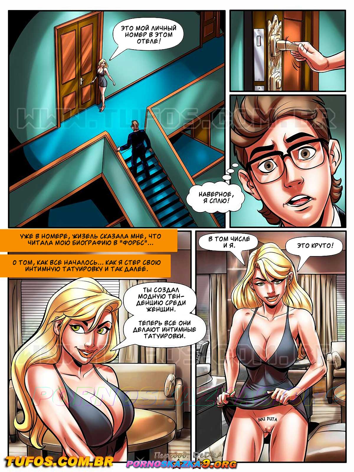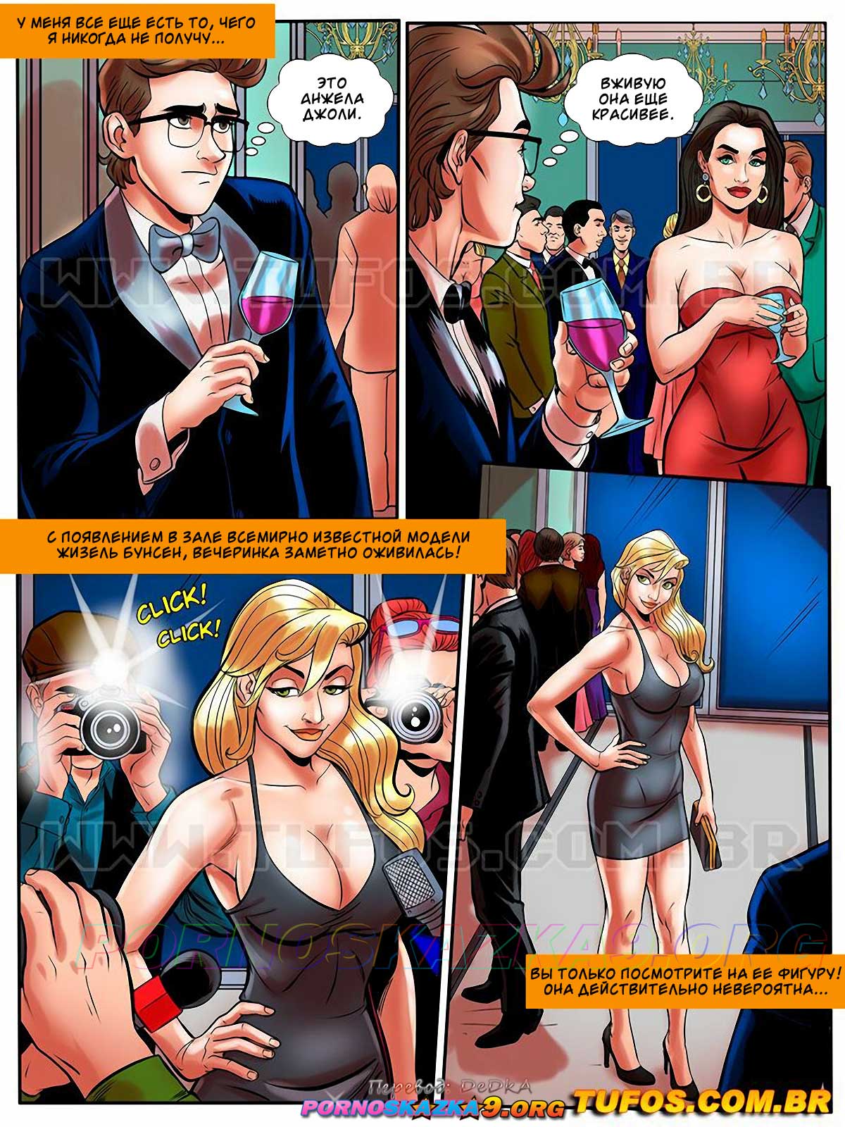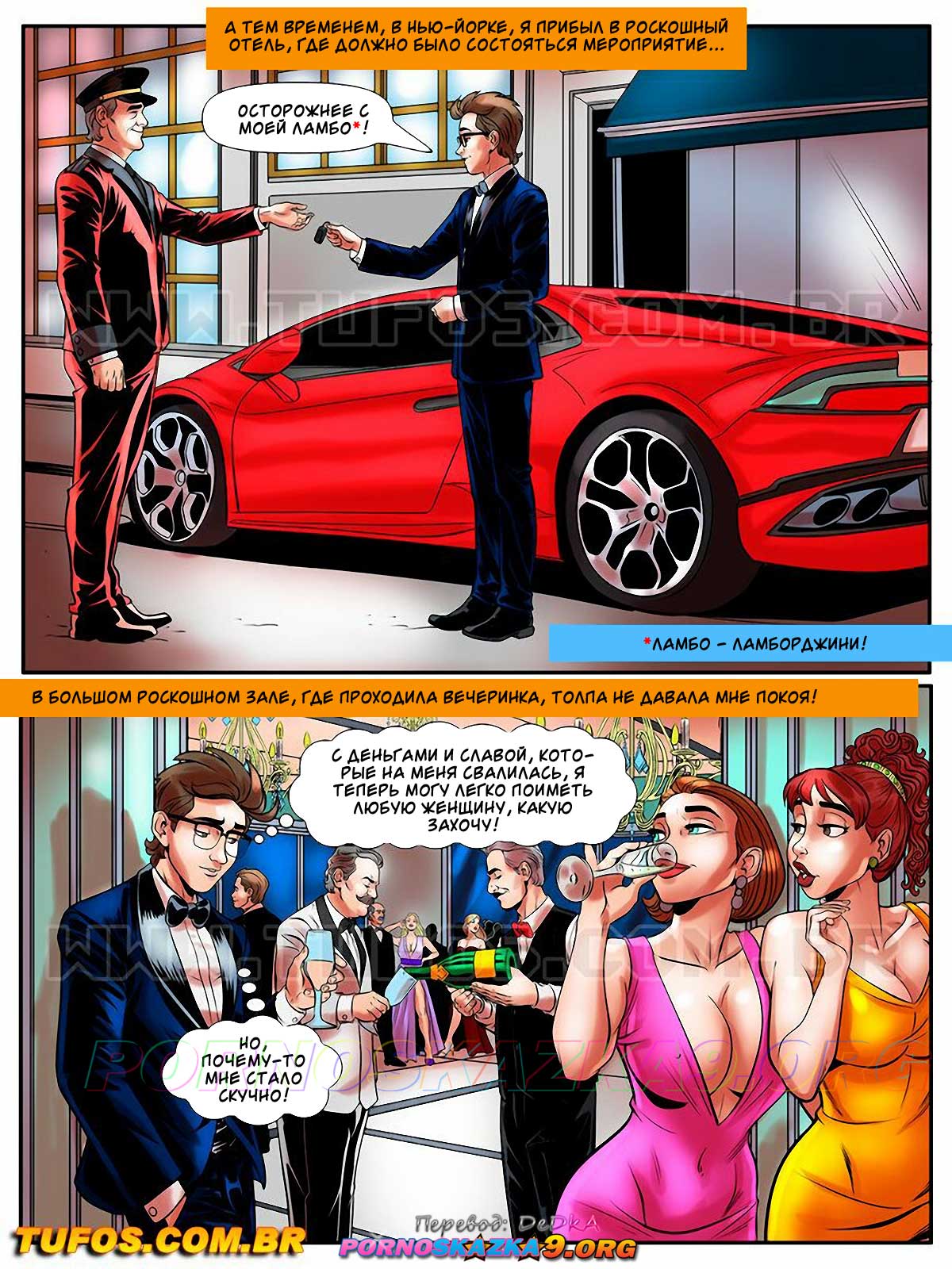 Секс комикс Похотливый ботан. Часть 43: В мире знаменитостей. O nerd comedor. Tufos. Мартин обзавелся деньгами и стал узнаваемым. Парня пригласили на большое торжество, где Мартин познакомился с аппетитной супер моделью. Знойная девушка пригласила парня к себе в номер, где Мартин ее хорошенько трахнул и накончал ей прямо в ротик…