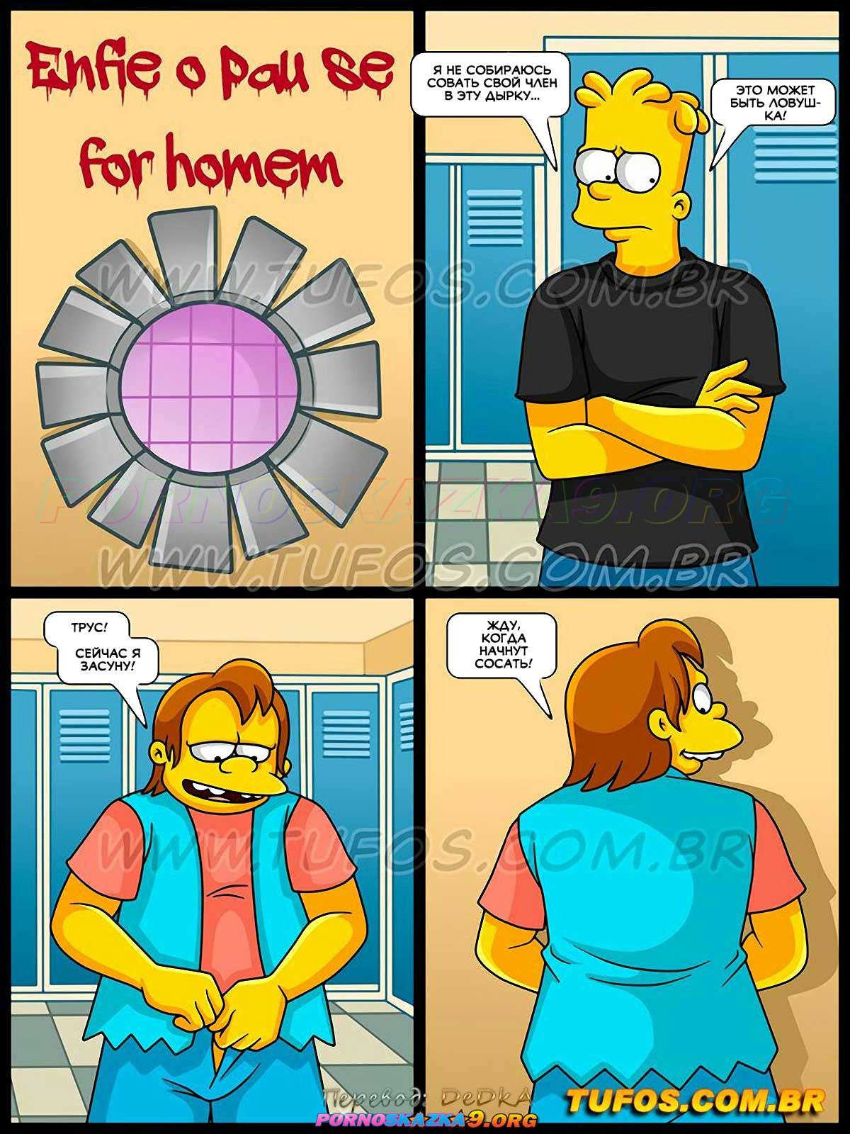 Секс комикс Симпсоны. Часть 56: Раздевалка для девочек. Барт и его похотливая банда проделали дыру в стене, чтобы подглядывать за девушками в душе… Но Мэгги увидела это и рассказала все подругам, но они, вместо того чтобы разозлиться, захотели еще больше «подогреть» хулиганов! И в один из дней, когда парни пришли подсматривать, их ждал большой сюрприз…