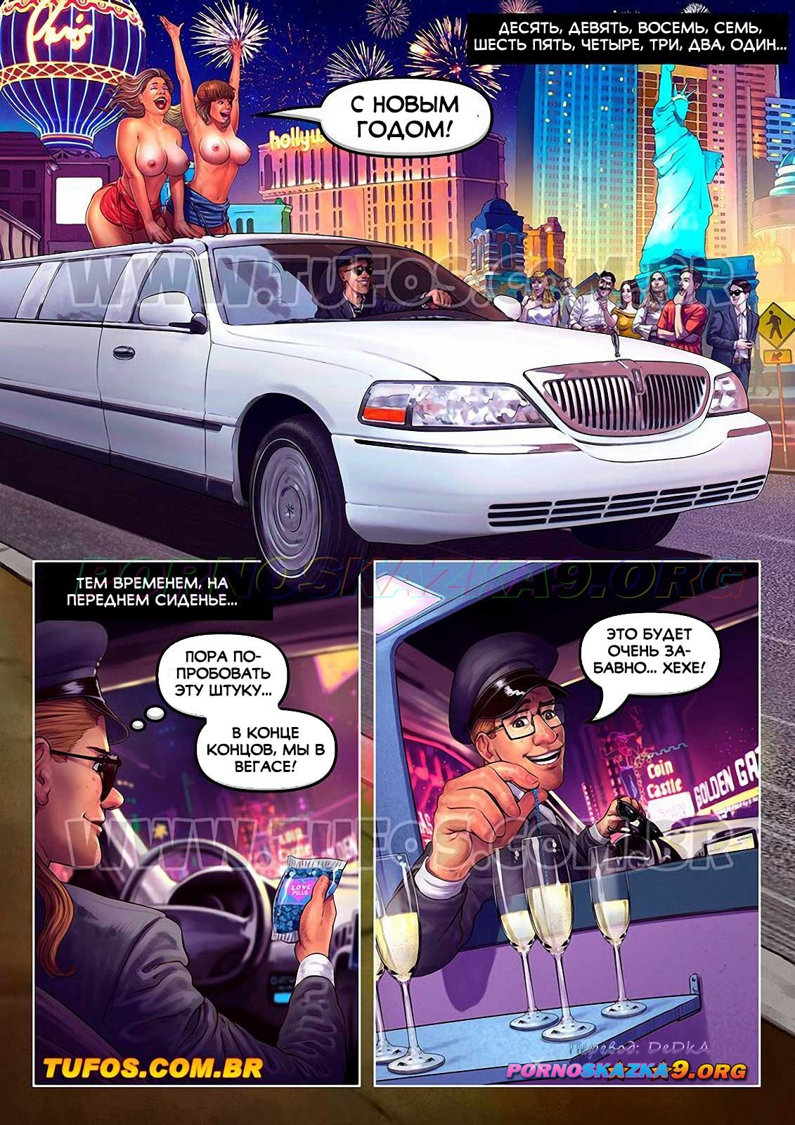 Секс комикс Семейка из трущоб 16. Новогодний выигрыш. Tufos Семейка из трущоб разбогатела, выиграв в лотерее. Они отправились праздновать новый год в ЛасВегас, где их водитель подсыпал им в шампанское афродизиак, после чего в машине произошла страстная оргия.