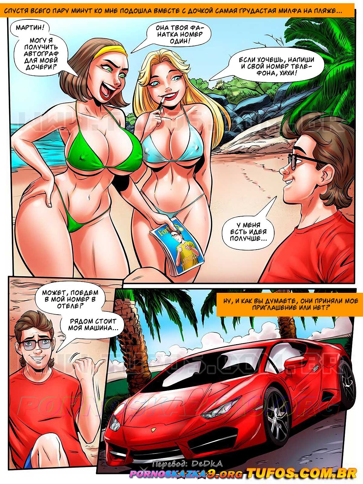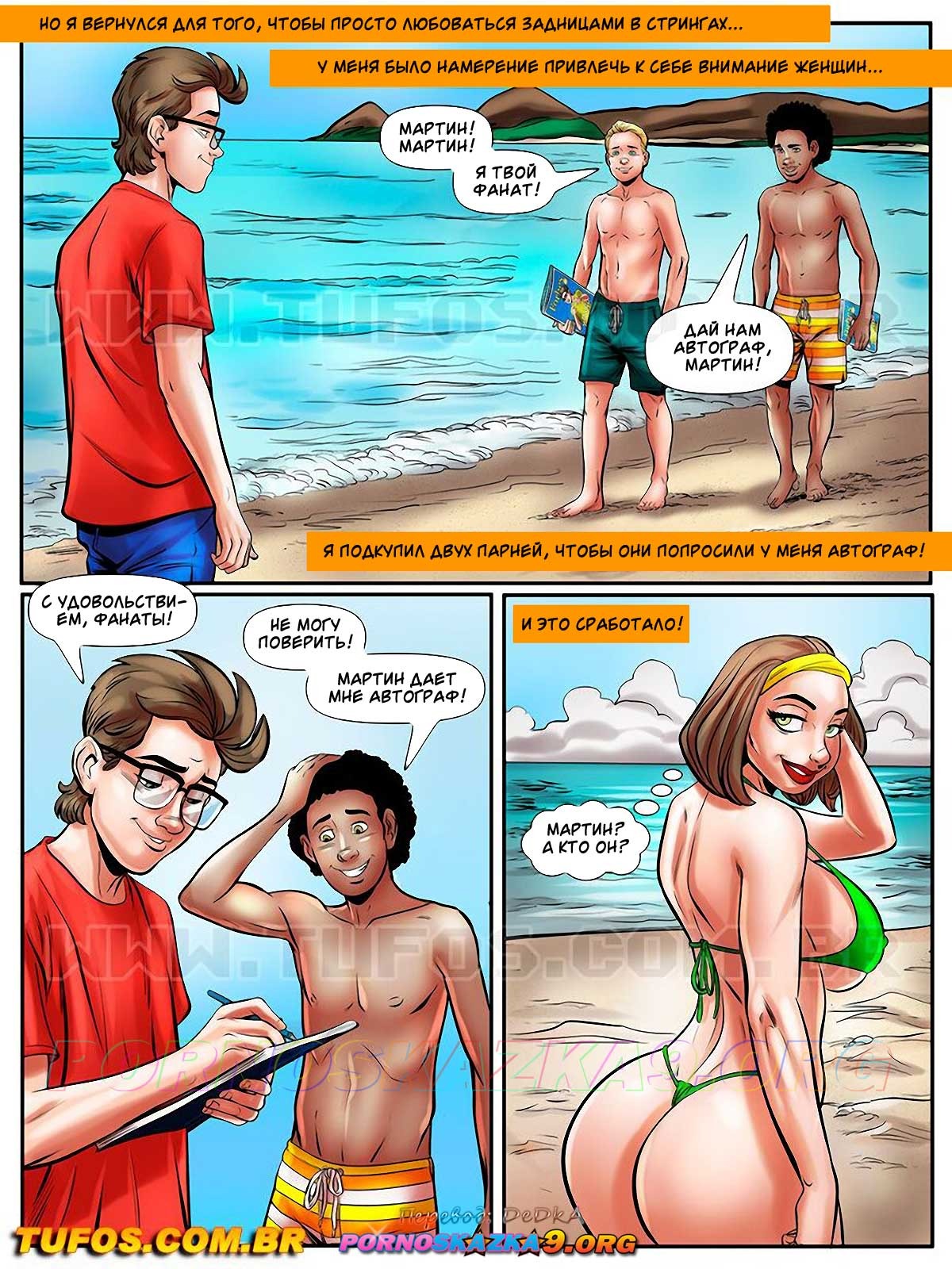 Секс комикс Похотливый ботан. Часть 49: Жить в собственное удовольствие. Мартин покидает мир знаменитостей, полный скучных проблем, чтобы жить в собственное удовольствие. Он возвращается в Бразилию, потому что только там на каждом шагу в изобилии имеются предметы его обожания — большие женские задницы! И вот, уже на пляже Копакабана, ботаник любуется лучшими задницами в мире, обдумывая план, как поиметь приглянувшуюся ему грудастую милфу, а заодно и ее дочку, задница которой не хуже, чем у ее мамаши…