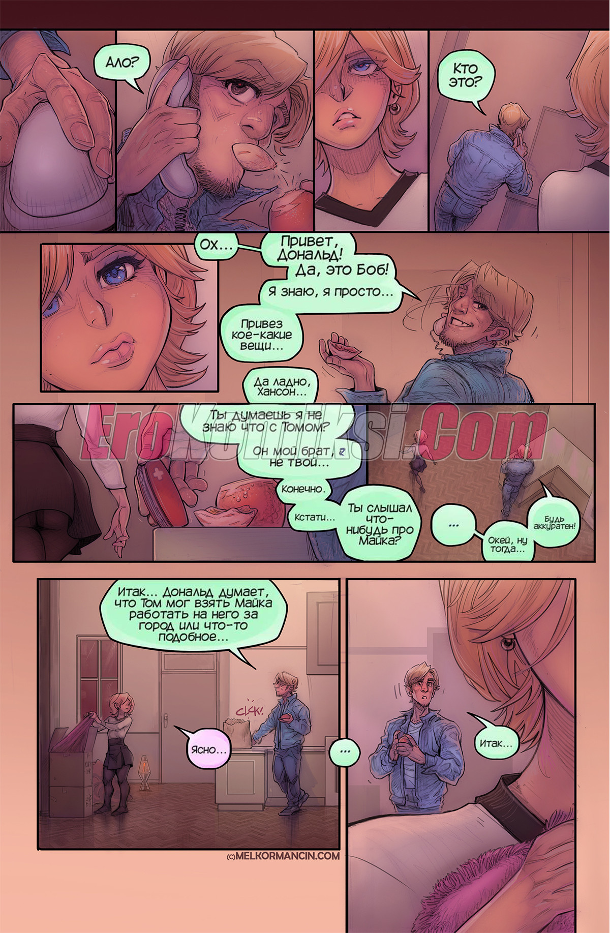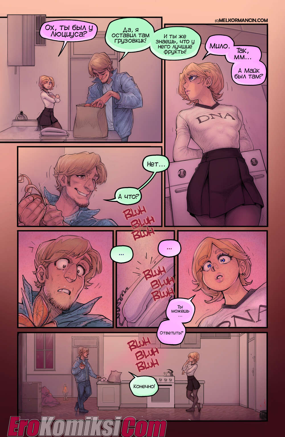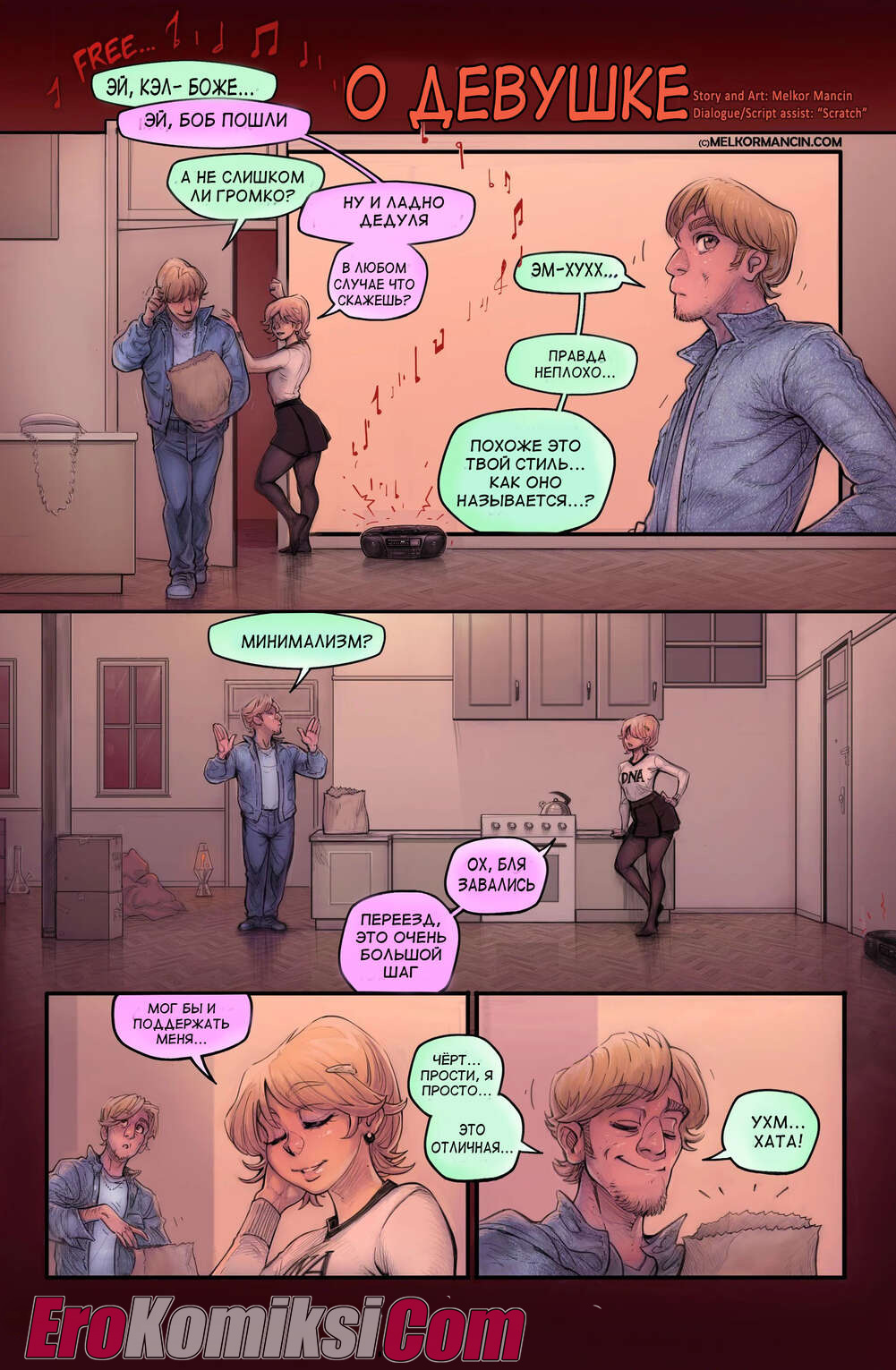 Секс комикс О девушке. About a girl. Melkor Mancin Парнишка приехал к своей подруге на новоселье. По дороге он прикупил фруктов, чтобы хорошо провести с ней время, но внезапно раздался телефонный звонок, который их потревожил..