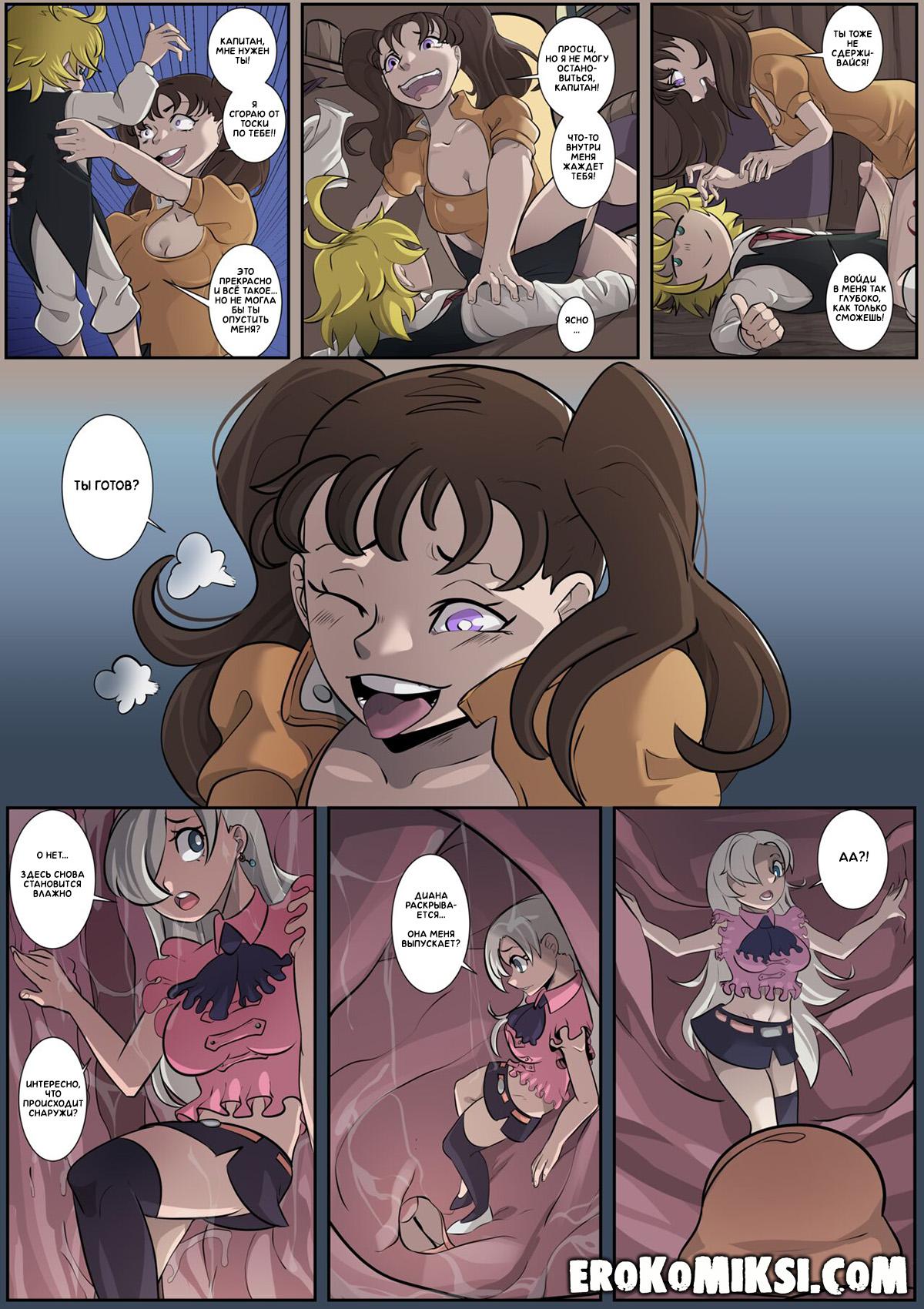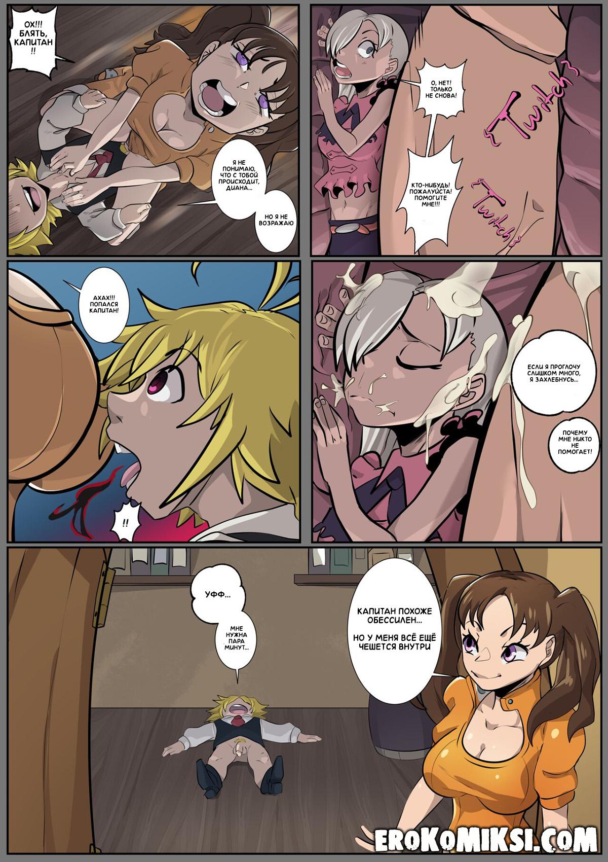 Секс комикс 7 смертных грехов. Я хочу глубже! У великанши Дианы чесалась киска после того, как она случайно засосала ей Элизабет. Диана отправилась к Мелиодасу, в надежде, что если он её трахнет, то зуд в киске пройдёт. Капитан трахнул Диану, но так как его член был слишком мал, он не смог её удовлетворить. Диана отправилась к Кингу, который в это время спал. Увидев огромный член Кинга, Диана забралась на него сверху и вогнала его член так глубоко в свою киску, как только могла…