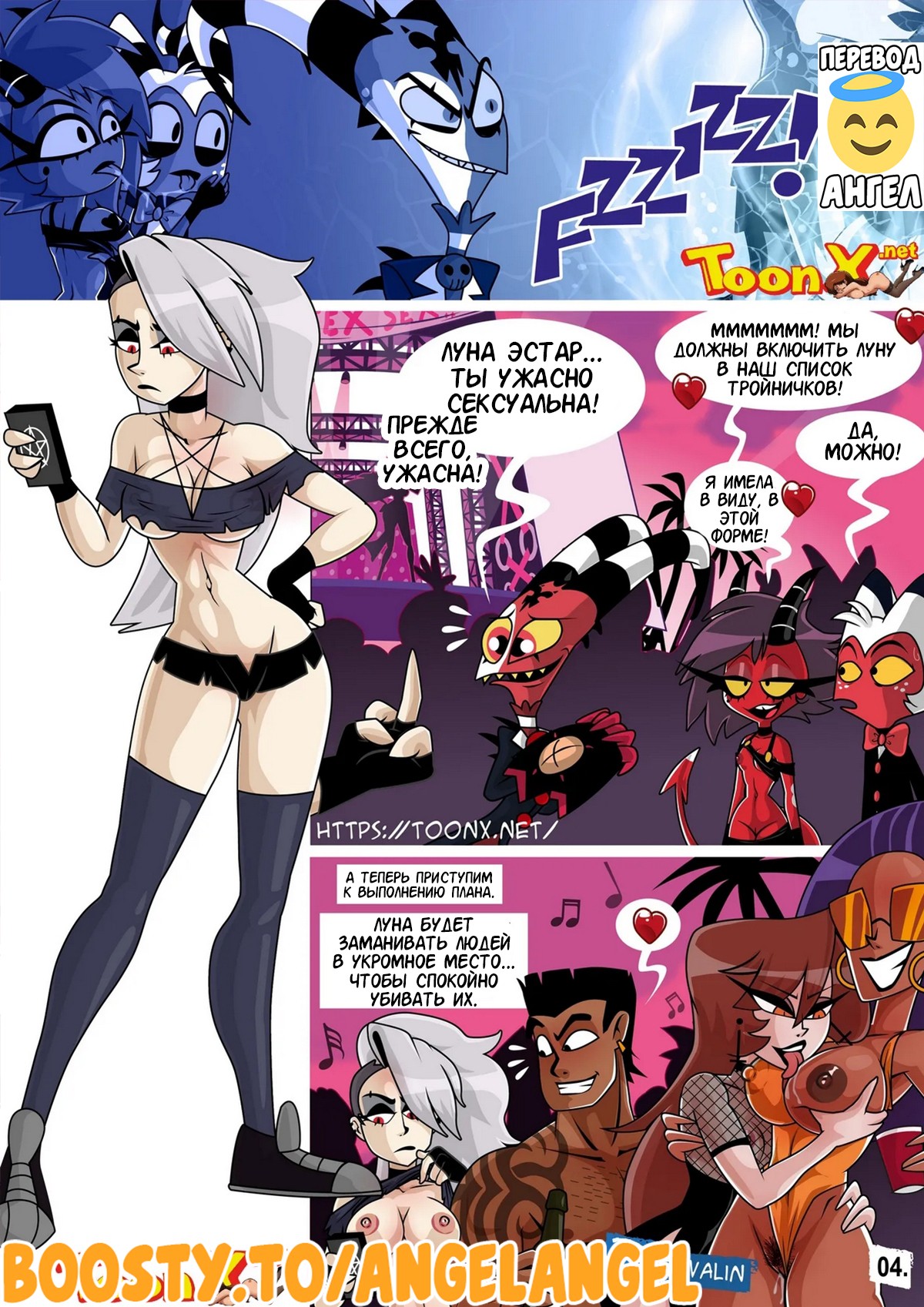 Секс комикс Адский босс. Верочка. Helluva Boss Verosika. Deavalin Горячая сисястая блондинка устроила концерт, чтобы устроить там огромную оргию и выиграть в споре со своим бывшим, который пообещал убить больше людей, чем тех, кто будет трахаться.