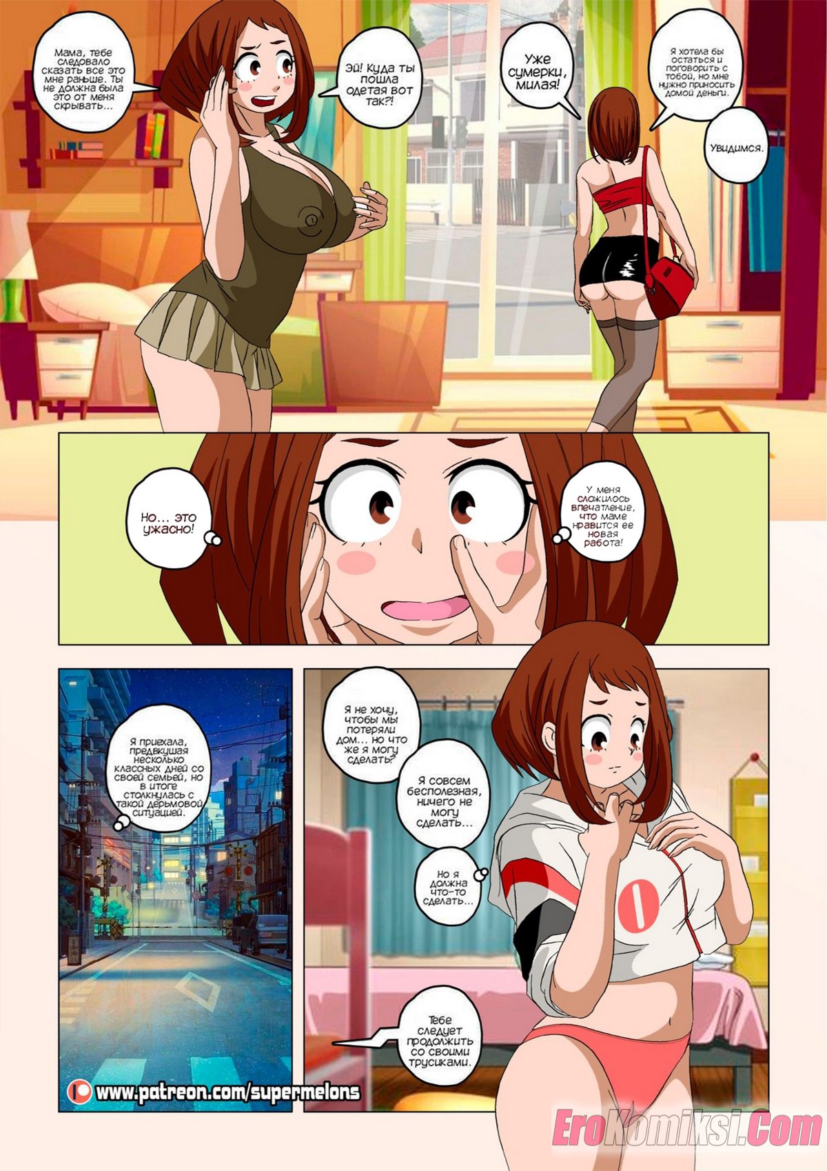 Секс комикс Академия. Вернуться домой. Back Home. Super Melons Горячая сисястая брюнетка поехала домой, используя выходные в академии. Там она застала свою сексуальную мамку за еблей с левым мужиком, после чего она узнала, что у ее семьи проблемы с деньгами.