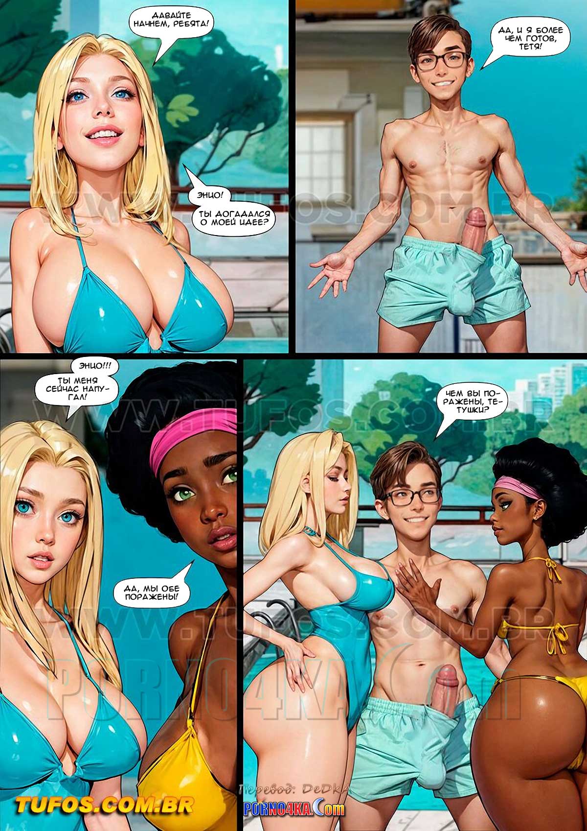 Секс комикс Анаконды. Часть 14: Месть Энцо. Энцо хочет отомстить своим друзьям… Худенький парень отправляется к одному из них, но не застает его дома! Но там Энцо обнаруживает матерей обоих друзей, которые уже знают обо всех проделках своих сыновей. Обе милфы хотят наказать своих сыновей, и, увидев Энцо, у них появляется идей о том, как это сделать…