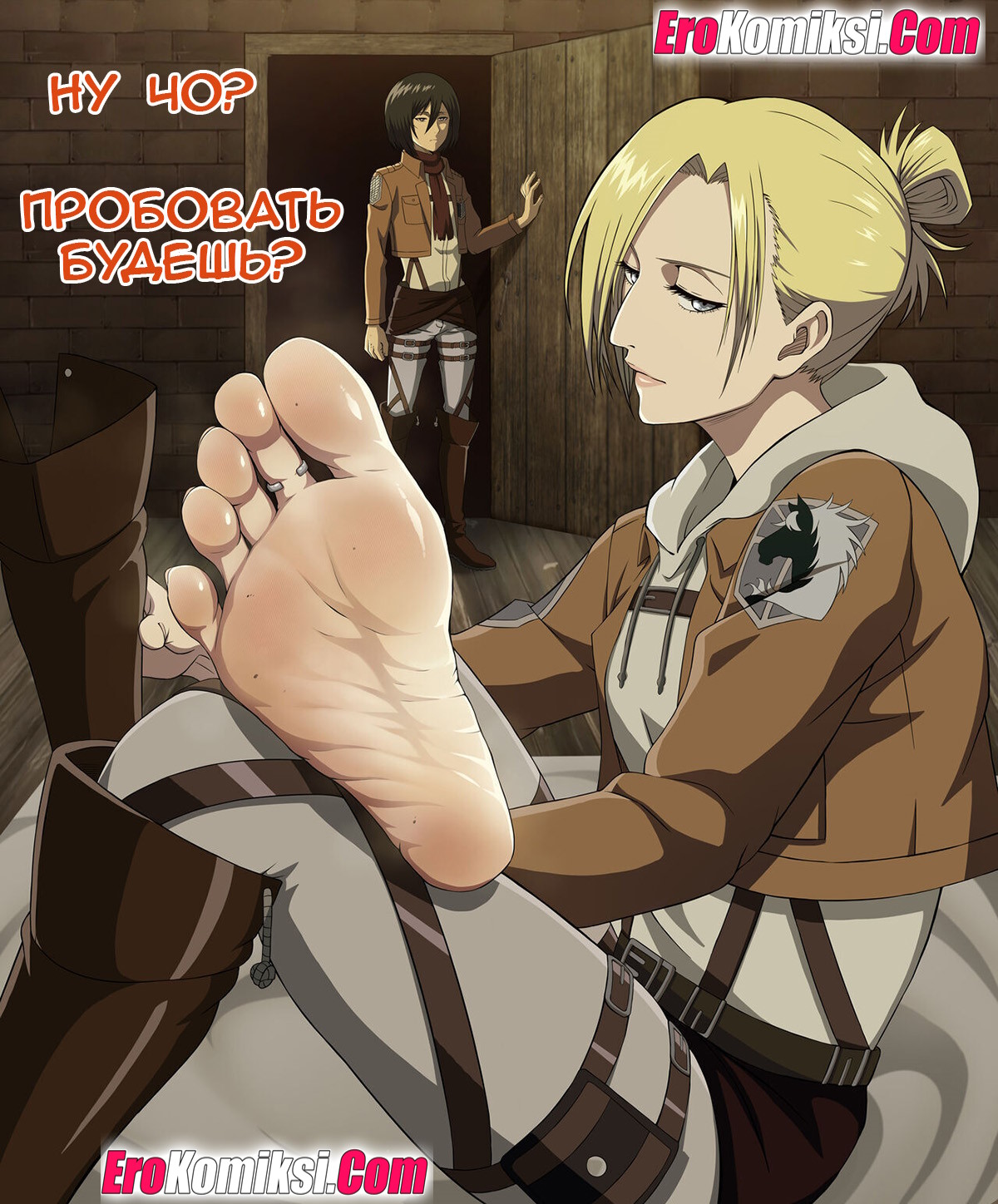 Секс комикс Атака Титанов: Испытание Эрена. У боевых групп, постоянно находящихся в стрессовых ситуациях должны были происходить расслабляющие процедуры, вот так выглядела одна из них. Ведь ничего лучше не расслабит, чем секс…
