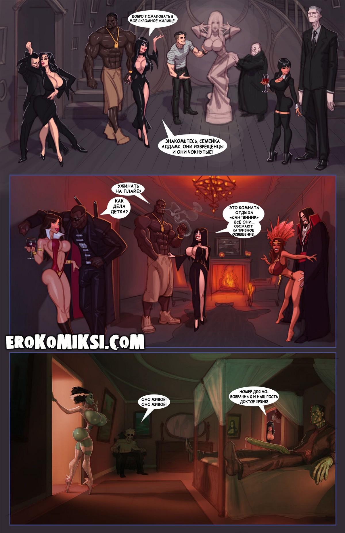 Секс комикс Бал монстров Эльвиры. Тёмная секси-вампирша приглашает всех чудовищ и монстров к себе в замок, но она не ожидала увидеть действительно огромного чёрного парня, который оттрахает её и её подруг во все узкие дырочки…