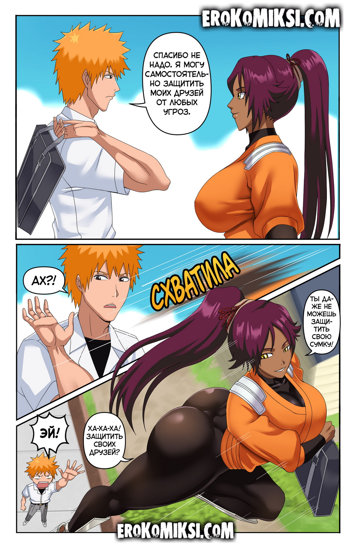 Секс комикс Блич. Йоруичи. По пути в школу Ичиго встретил Йоруичи. У них случилась стычка, где юноша показал свою силу, что понравилось девушке. И она захотела большего…