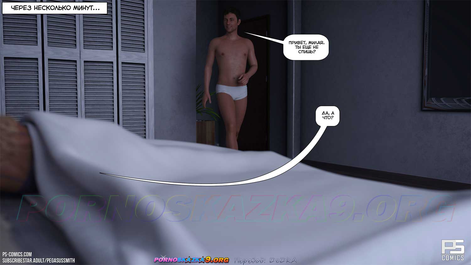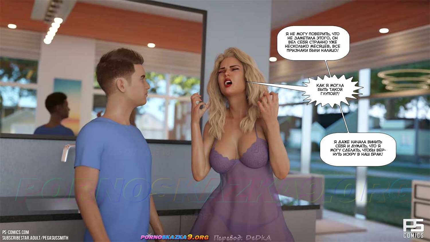 Секс комикс Блуд в лесу. Часть 5. Лорен просит Джонни больше не допускать таких рискованных поступков, как прошлой ночью, потому что если бы Джефф не задержался так долго в ванной, он бы поймал их! Но Джонни сообщает Лорен такую новость, которая отодвигает на задний план все беспокойства Лорен по поводу Джеффа…
