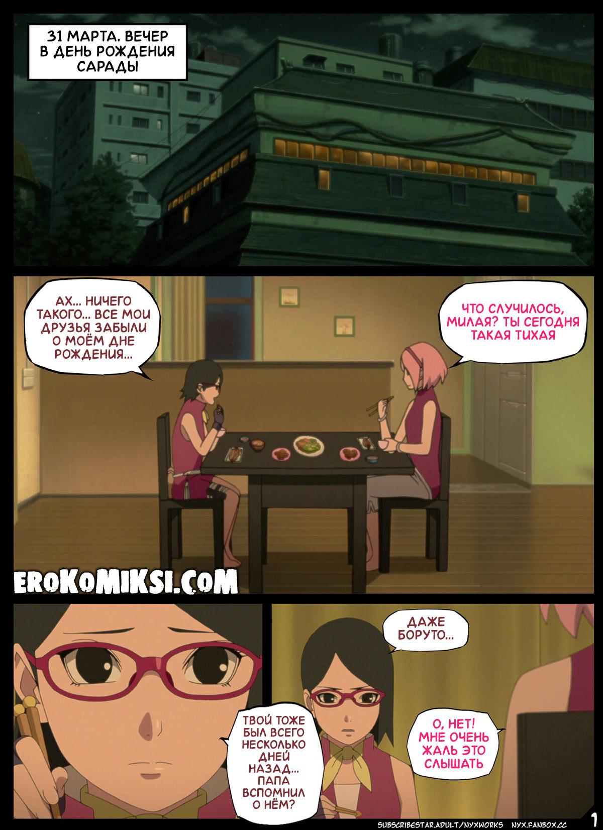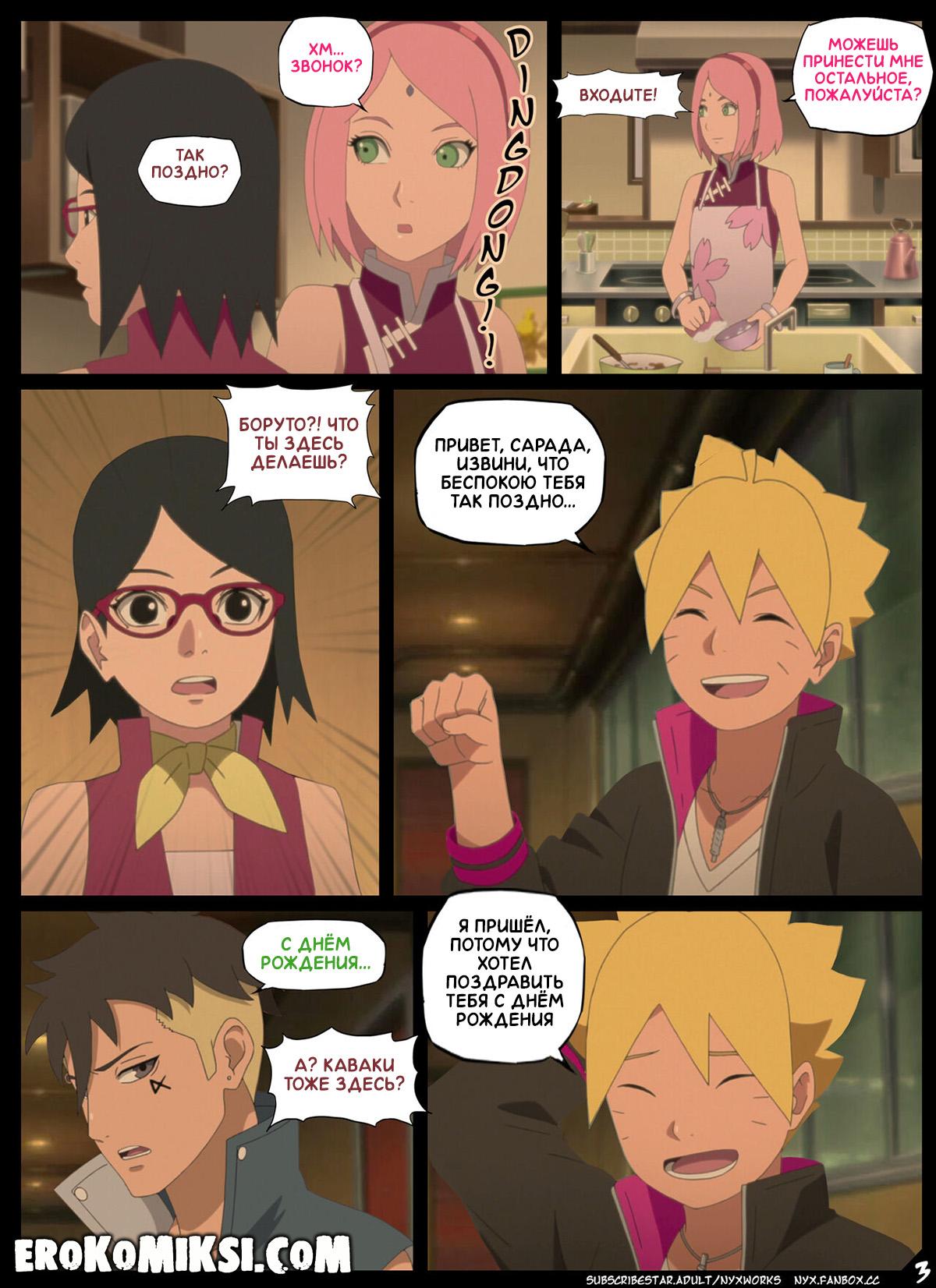 Секс комикс Боруто. Забытый День Рождения. В свой день рождения, Сарада сидит со своей мамой Сакурой и переживает, что все позабыли о её дне рождения и никто её не поздравил. Но под самый вечер, в гости к Сараде всё же пришли Боруто и Каваки. Парни забыли купить подарок, но Боруто решил поздравить свою подружку качественным сексом. Сарада разозлилась на Боруто и заявила, что её будет трахать Каваки, ну а чтобы Боруто не скучал, Сакура обещала хорошенько о нём позаботиться…