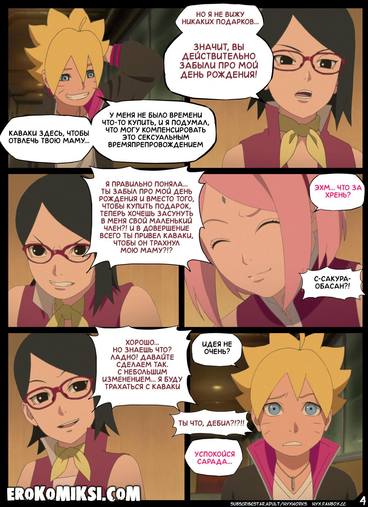 Секс комикс Боруто. Забытый День Рождения. В свой день рождения, Сарада сидит со своей мамой Сакурой и переживает, что все позабыли о её дне рождения и никто её не поздравил. Но под самый вечер, в гости к Сараде всё же пришли Боруто и Каваки. Парни забыли купить подарок, но Боруто решил поздравить свою подружку качественным сексом. Сарада разозлилась на Боруто и заявила, что её будет трахать Каваки, ну а чтобы Боруто не скучал, Сакура обещала хорошенько о нём позаботиться…