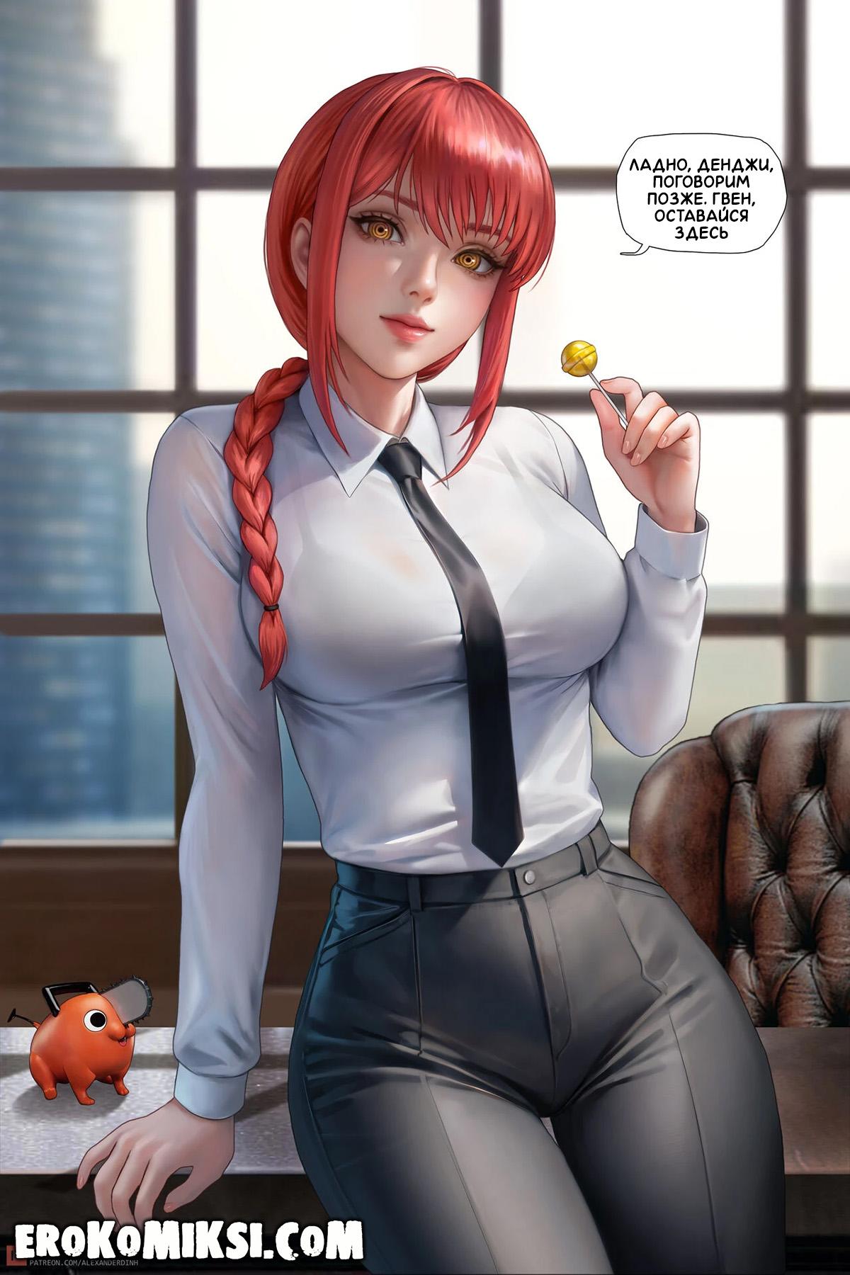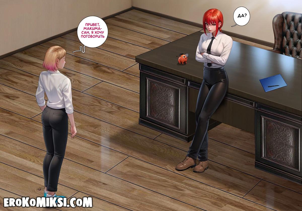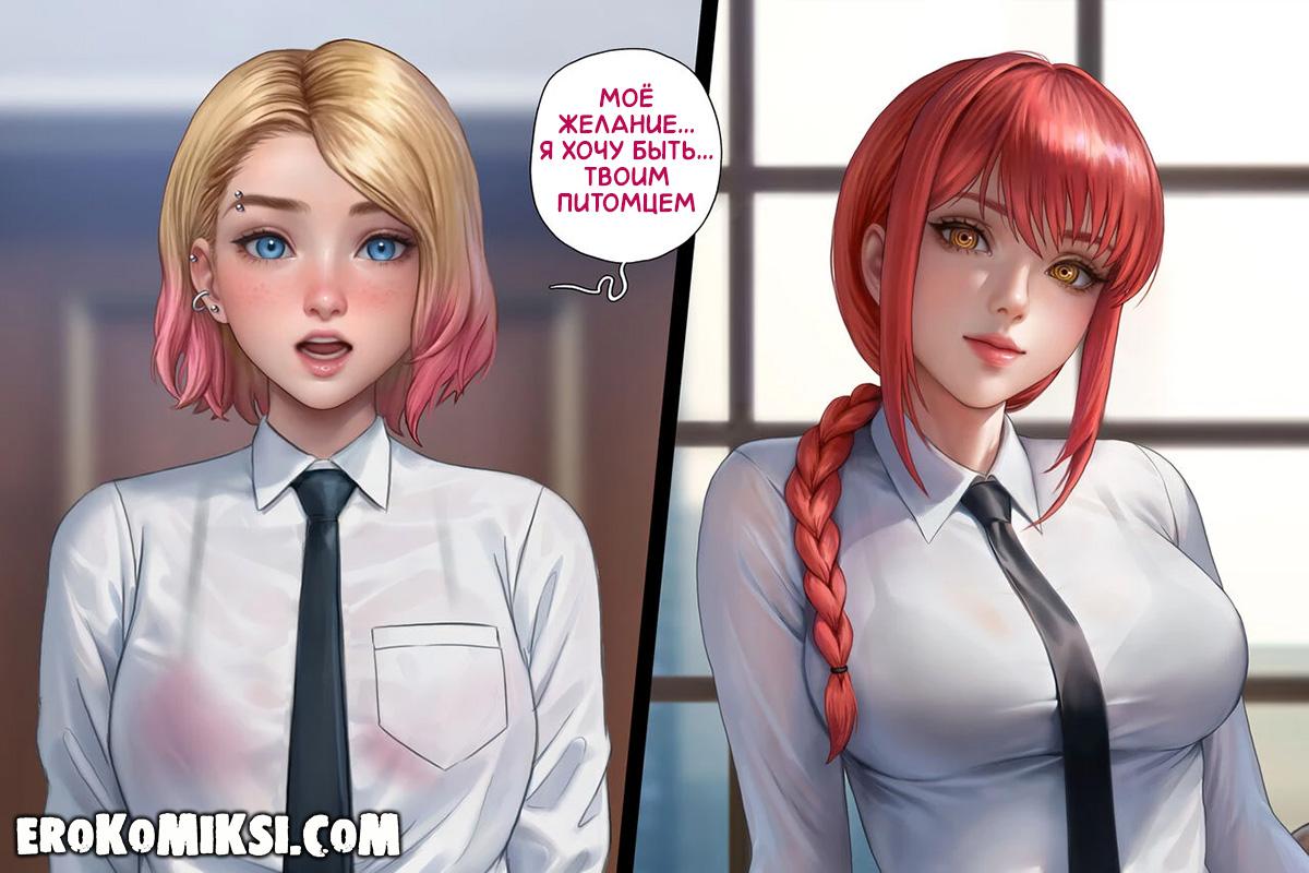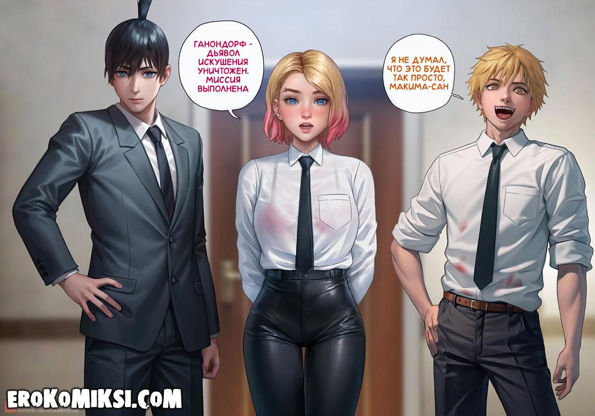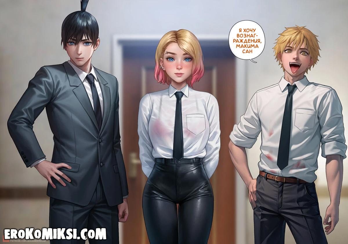 Секс комикс Человек-Бензопила. Дьявольское вознаграждение. Гвен работает в Бюро безопасности и Макима решает её вознаградить за отличное несение службы, и разрешает просить всё, что она пожелает. Вечером Гвен застаёт трахающихся Денджи и Макиму, и решает в качестве награды, стать личной собачкой Макимы. Не долго думая, Макима раздевает Гвен и трахает по полной программе…