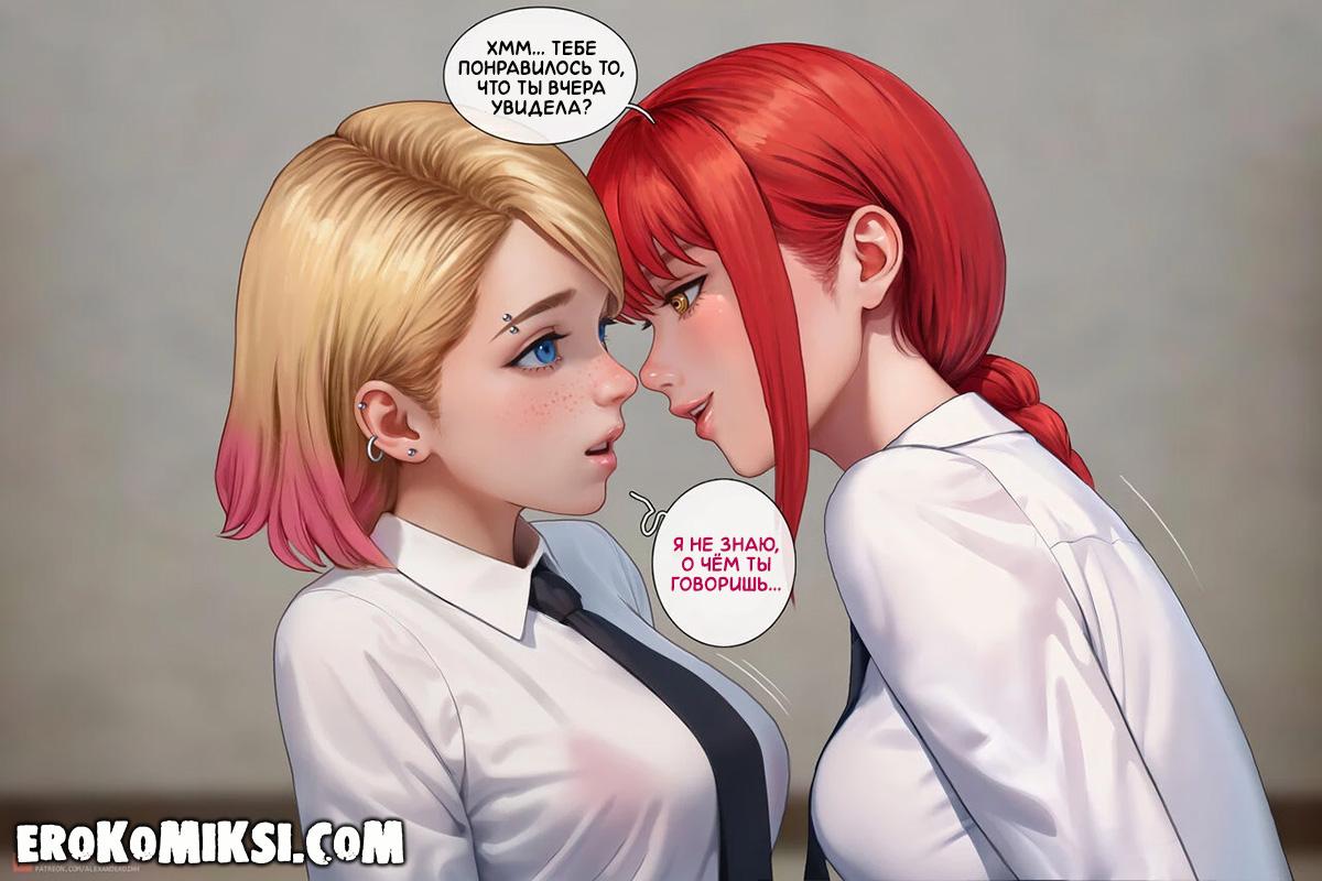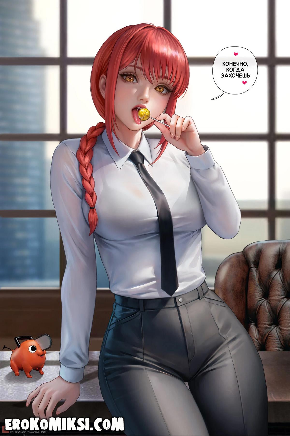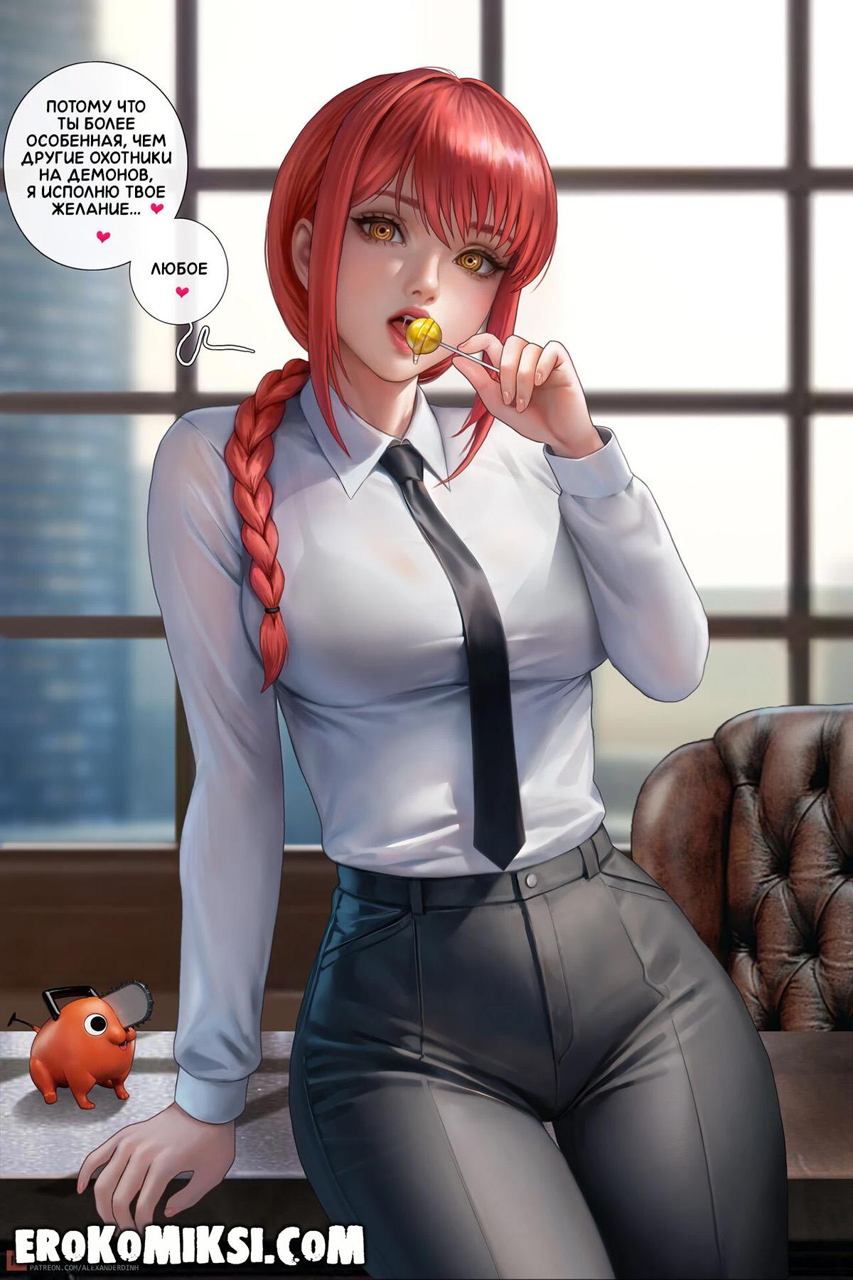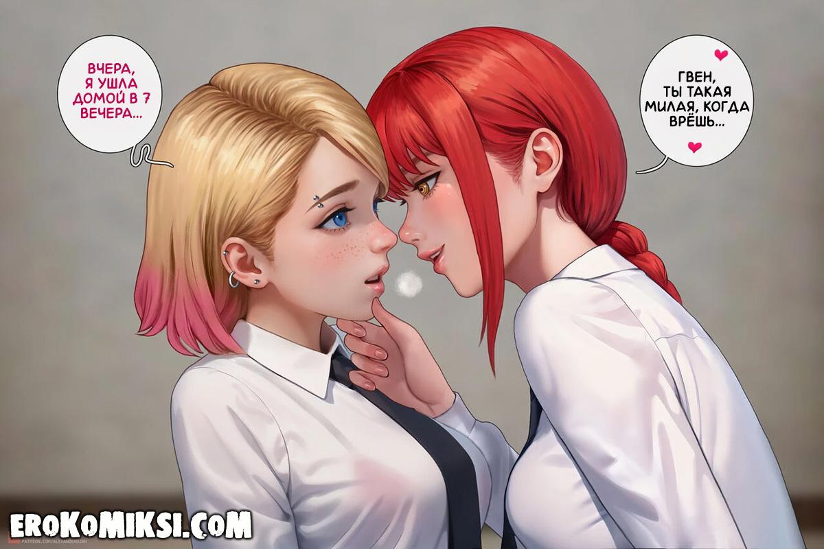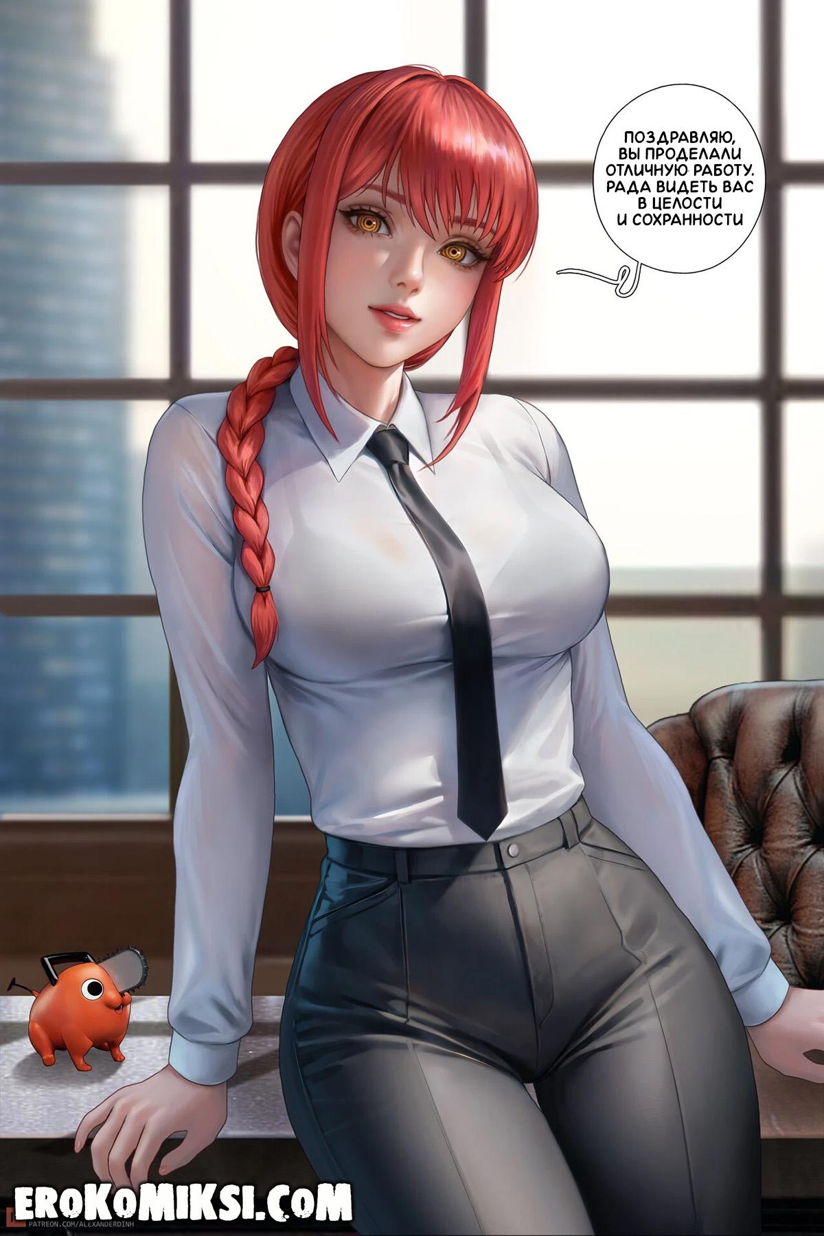 Секс комикс Человек-Бензопила. Дьявольское вознаграждение. Гвен работает в Бюро безопасности и Макима решает её вознаградить за отличное несение службы, и разрешает просить всё, что она пожелает. Вечером Гвен застаёт трахающихся Денджи и Макиму, и решает в качестве награды, стать личной собачкой Макимы. Не долго думая, Макима раздевает Гвен и трахает по полной программе…
