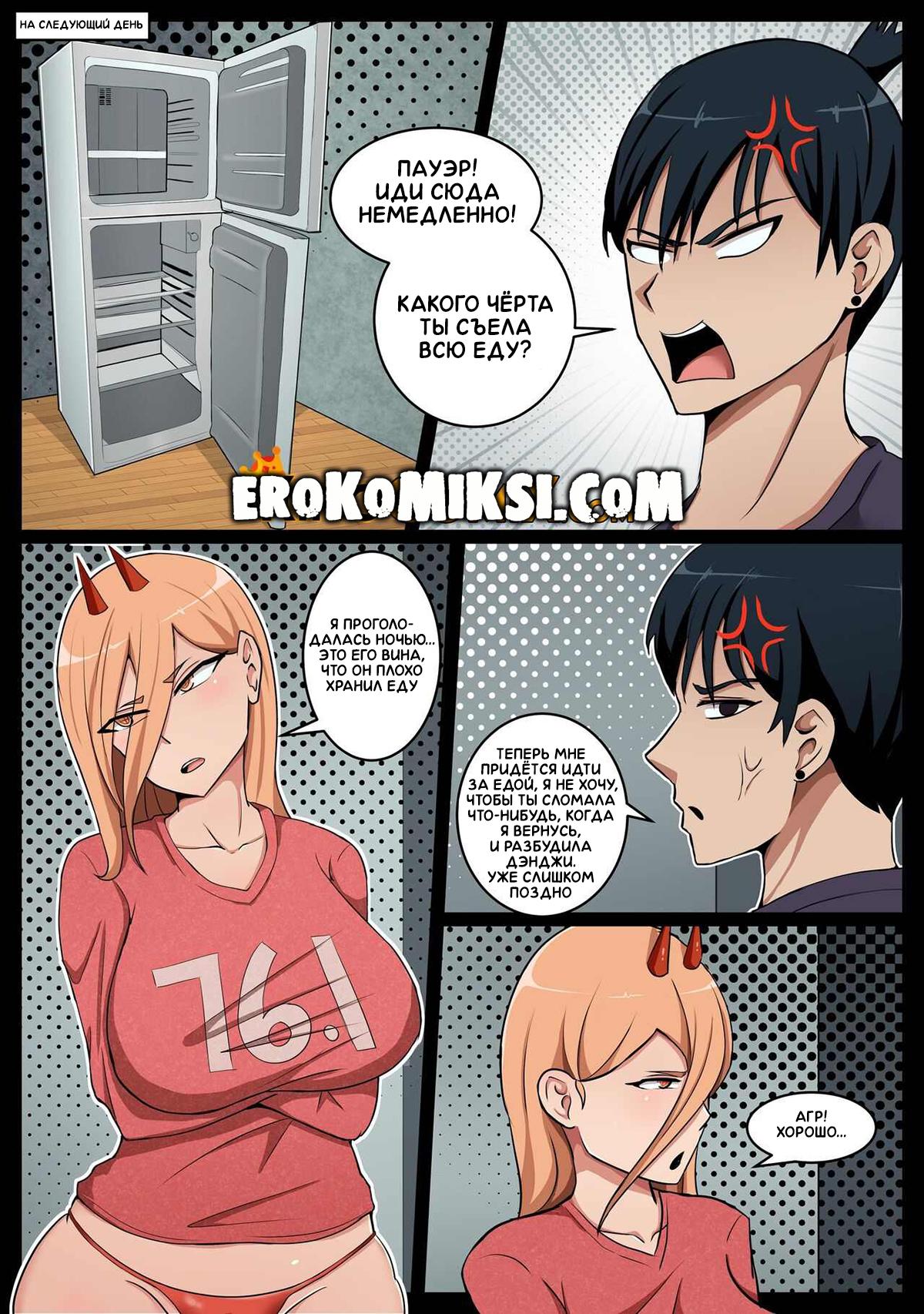Секс комикс Человек-Бензопила. Похотливая Пауэр. Пока Аки ходил за продуктами, Пауэр пробралась в спальню к Дэнджи и начала сосать его огромный член. Проснувшись от минета, Дэнджи начал ругать Пауэр за то, что та похотлива и позволяет себе такие вещи, но Пауэр говорит, что Дэнджи трус и садится на его член. Разозлённый, что его считают трусом, Дэнджи ставит Пауэр раком и начинает трахать со всей силы её текущую от возбуждения киску…
