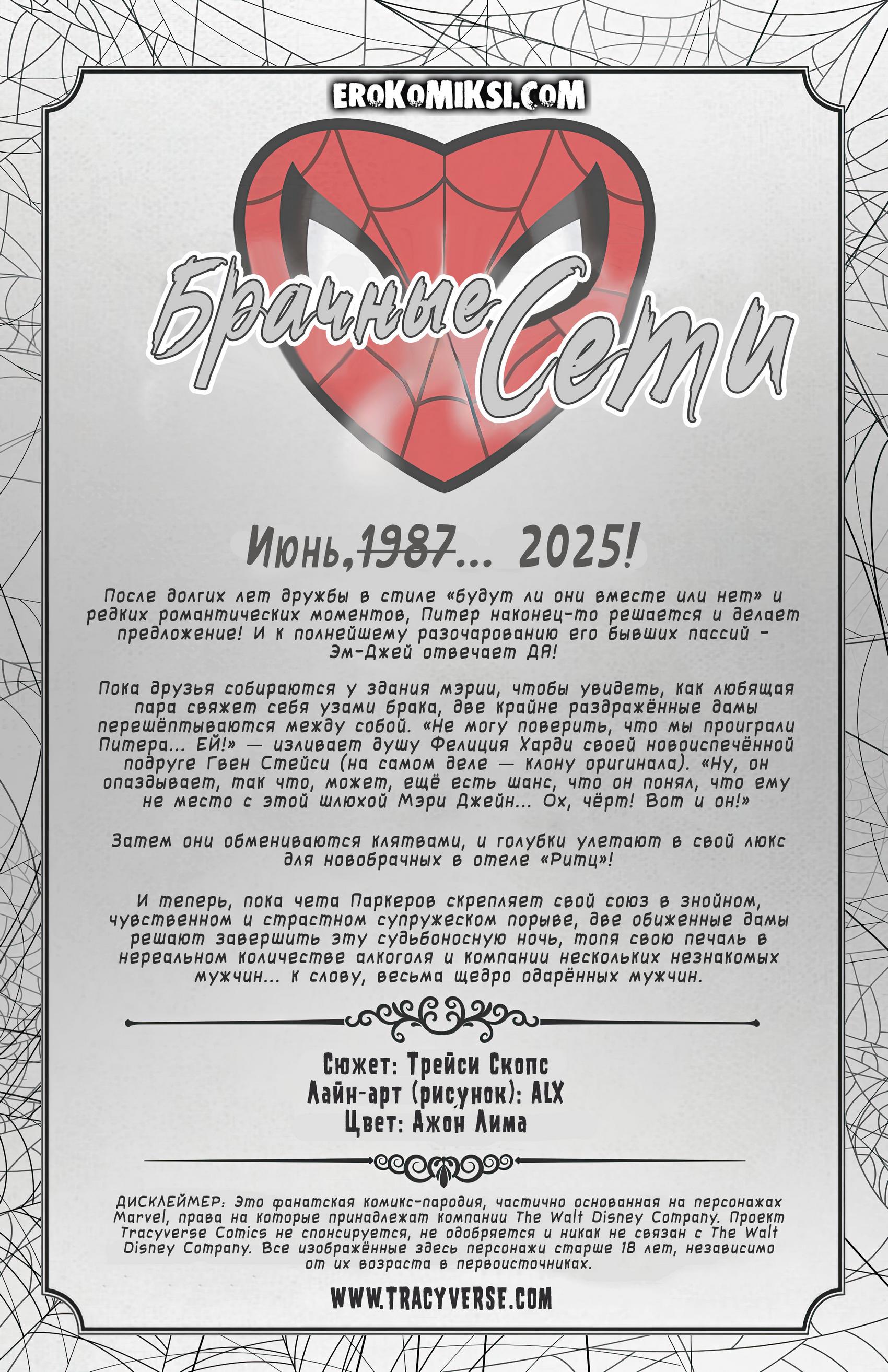 Секс комикс Человек паук. Брачные сети. После долгих лет сомнений и сложных отношений Питер наконец делает предложение Мэри Джейн — и она соглашается. Новость становится ударом для его бывших пассий, которые не скрывают раздражения и разочарования. Пока проходит свадебная церемония, Фелиция Харди и Гвен Стейси обсуждают происходящее, всё ещё надеясь, что что-то пойдёт не так. Но свадьба всё же состоялась, и молодожёны отправляются отмечать в отель. Тем временем две обиженные девушки решают провести ночь по-своему — с алкоголем и случайной компанией, пытаясь забыть о случившемся.