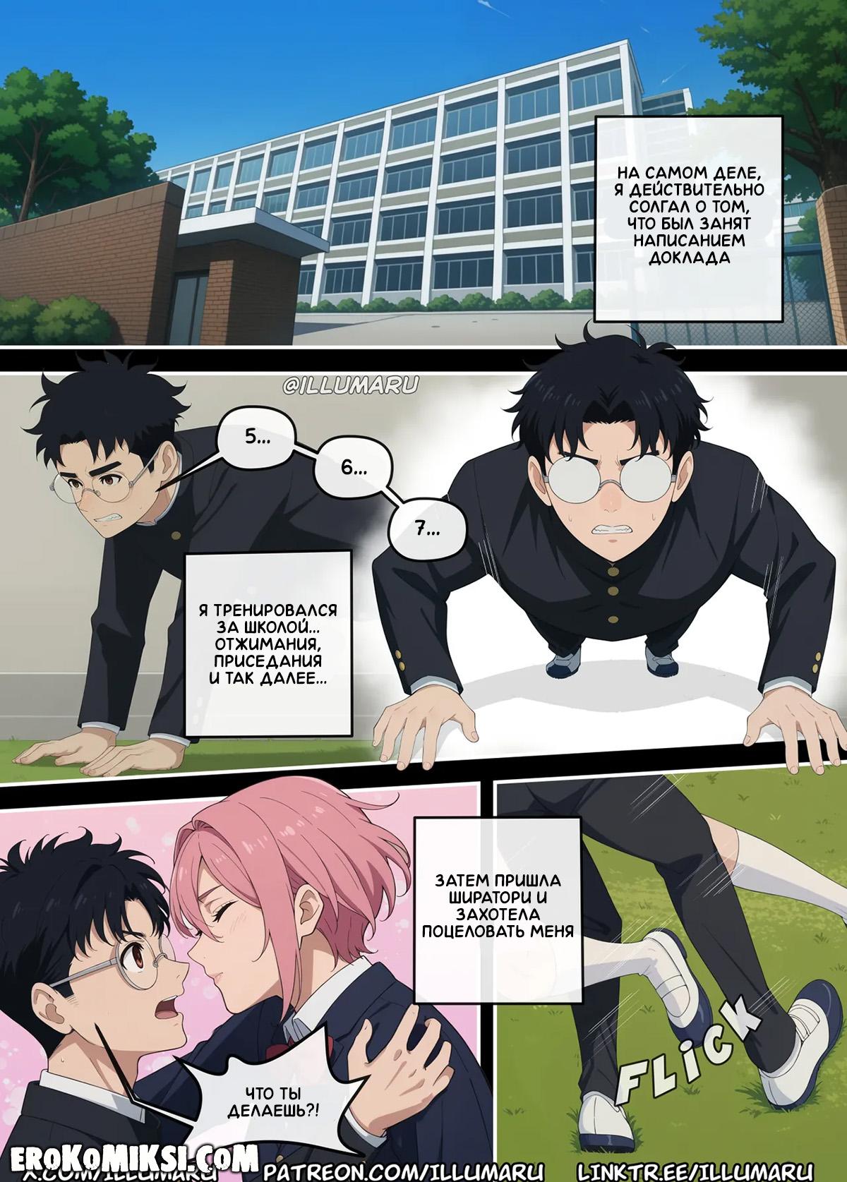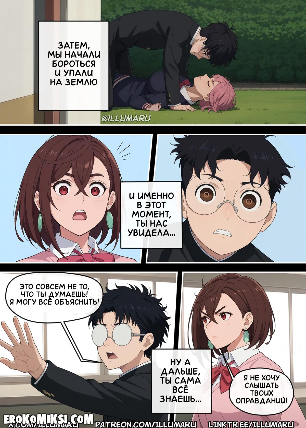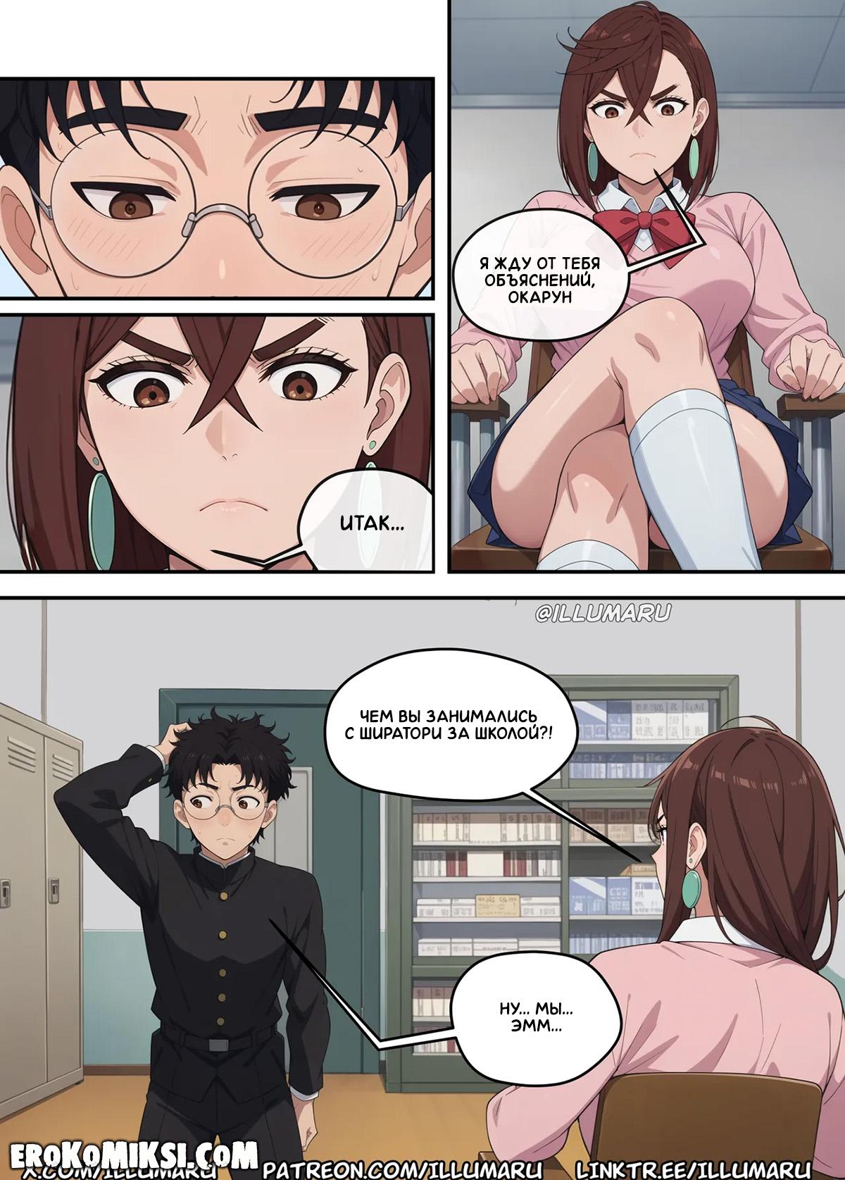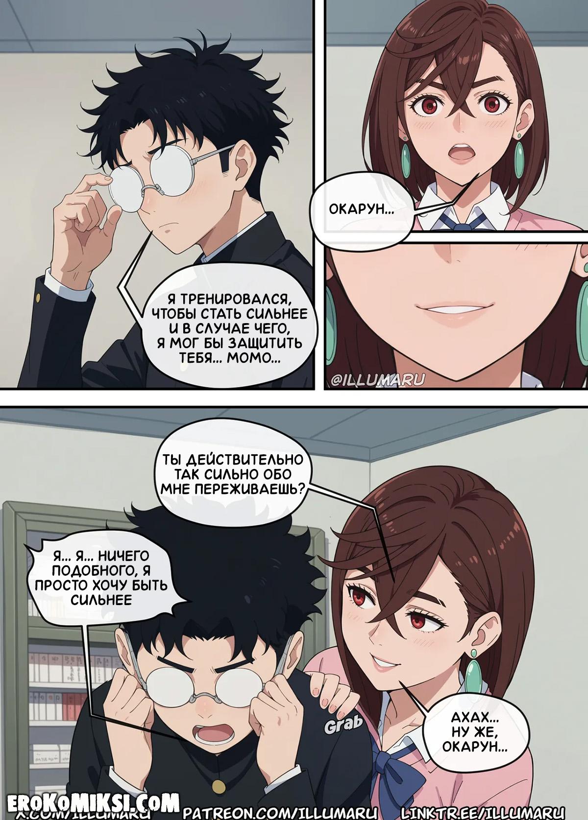 Секс комикс DanDaDan. Кто получит Окаруна? Айра хотела поцеловать Окаруна и это увидела Момо, которая теперь требует от него объяснений, хотя знает, что это была случайность и он не виноват. Пытаясь объясниться, Окарун возбуждается и видя огромную выпуклость в штанах парня, Момо решает успокоить его минетом, но в этот момент появляется Айра.