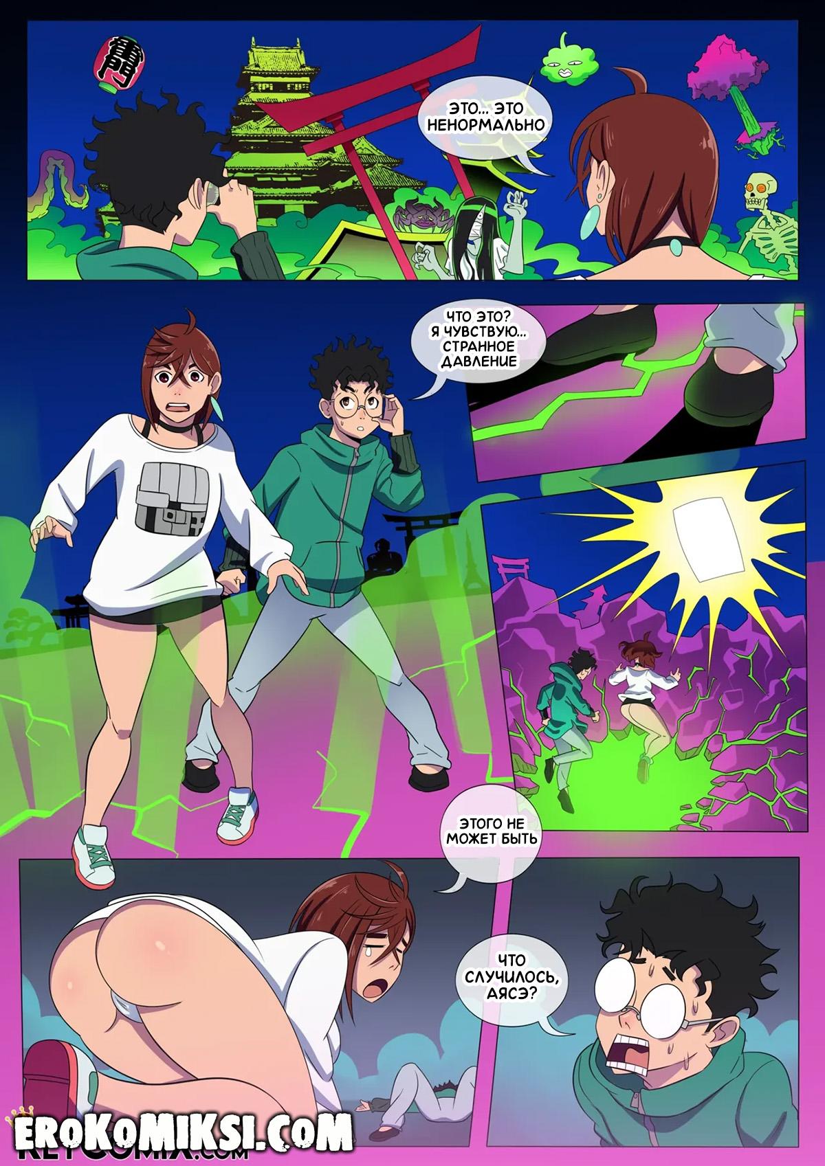 Секс комикс DanDaDan. Накопившаяся энергия. Момо срочно нужна помощь Окаруна, чтобы закрыть портал призраков. Она просит парня изо всех сил прижать её к себе и держать, но она не предполагала, что упрётся задницей в пах Окаруна и от этого у него встанет член…