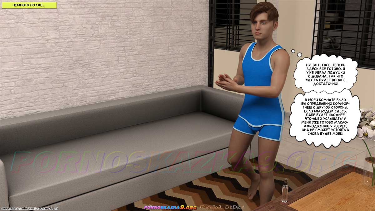 Секс комикс Домашняя работа. Часть 6. Семья вернулась домой из ресторана. Отец Калела сразу стал жаловаться на то, что он устал и хочет принять душ и лечь спать. То же самое сказала и Кэтлин, после чего Калел предложил ей после душа зайти к нему в комнату, где он сделает ей превосходный расслабляющий массаж перед сном…