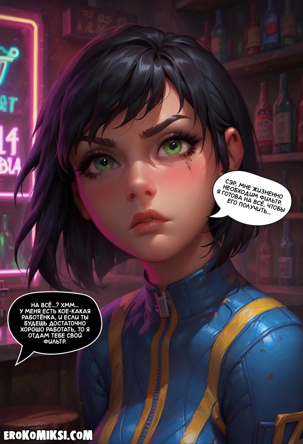Секс комикс Fallout. Покидая убежище. Часть 1. Чтобы раздобыть фильтр для воды, Дженна отправляется в ближайший бар, где владелец бара предлагает ей работу, чтобы купить фильтр, и Дженна вынуждена согласиться, ещё не зная, что это будет за работа…