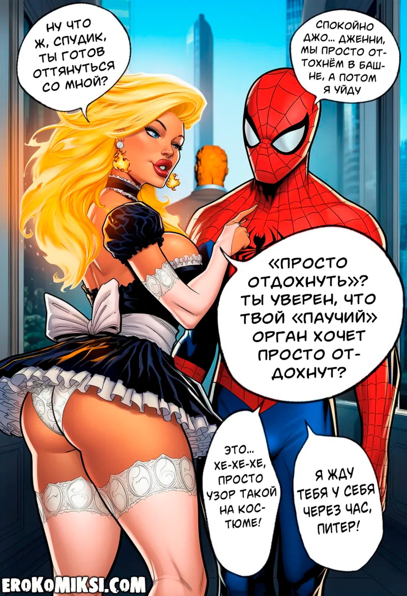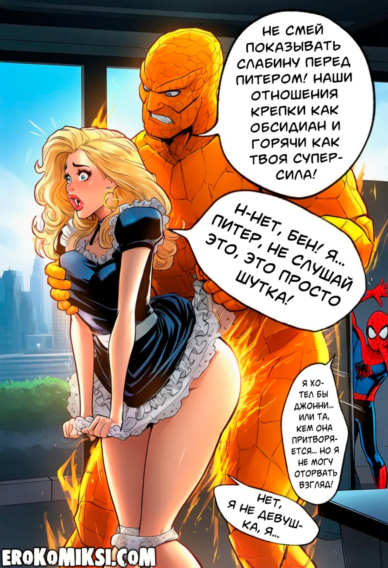 Секс комикс Фантастическая четверка. Человек — Факел. Новая форма. В рядах фантастической четверки невероятное — появилась еще одна женщина, а Человек-паук невольным свидетелем того, как эту женщину жестко трахают…