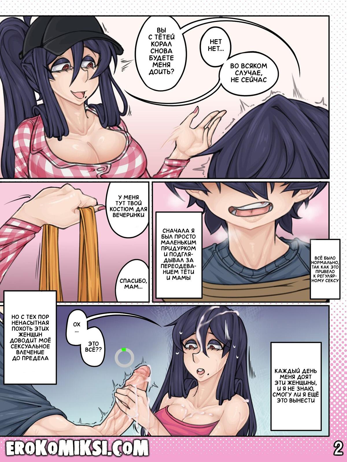 Секс комикс Ферма тёти. Горячая вечеринка. Корал и Марина днями напролёт выдаивают сперму из члена Финна и совсем не дают пареньку прохода. Сегодня вечером намечается вечеринка и Корал с Кои и Финном отправляются на такси в указанное место, где их уже ожидает Марина. По пути на вечеринку, Корал и Кои как следует разогревают огромный член Финна, но не дают ему кончить, так как всё самое интересное ожидает паренька на вечеринке…