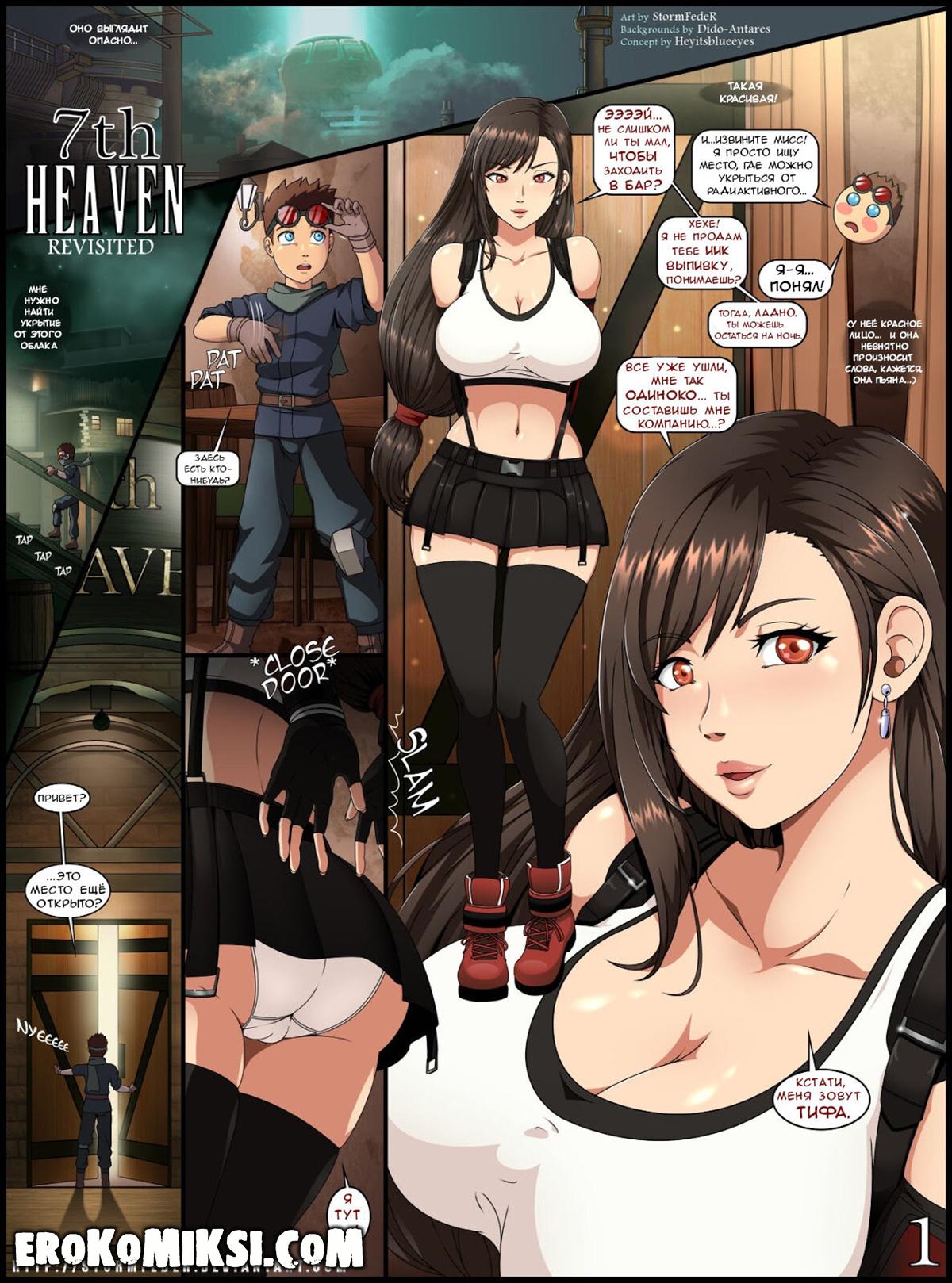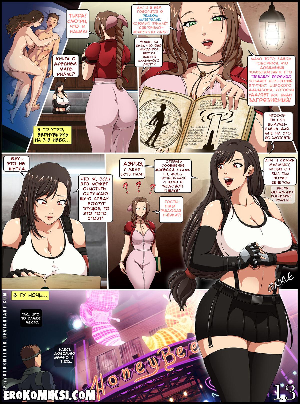 Секс комикс Final Fantasy VII. Чёрное облако. Пытаясь скрыться от чёрного облака, парень забрёл в бар к Тифе, которая была пьяна и решила позабавиться с пареньком. Она сняла с себя трусики и встала раком, чтобы парень её трахнул и в это время вернулась Аэриз, которая была впечатлена размером члена паренька и присоединилась к ним. Парень трахал красоток всю ночь напролёт и залил их своей горячей спермой…