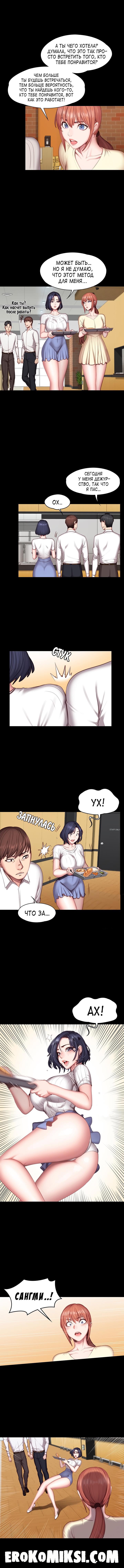 Секс комикс Фитнесс. Часть 50. Без цензуры!!! На следующий день, после свидания, Юи начала расспрашивать Сангми о том, как всё прошло, но Сангми была не в духе, так как ей совсем не понравилось. Сангми спотыкается и начинает падать, но её вовремя ловит молодой парень Кан-Джун. Юи рассказывает Сангми, что это новый заместитель директора и все девушки отдела положили на него глаз. Между тем, мать Сангми решается посетить фитнесс-центр по флаеру, который ей дал Донг-Джун…