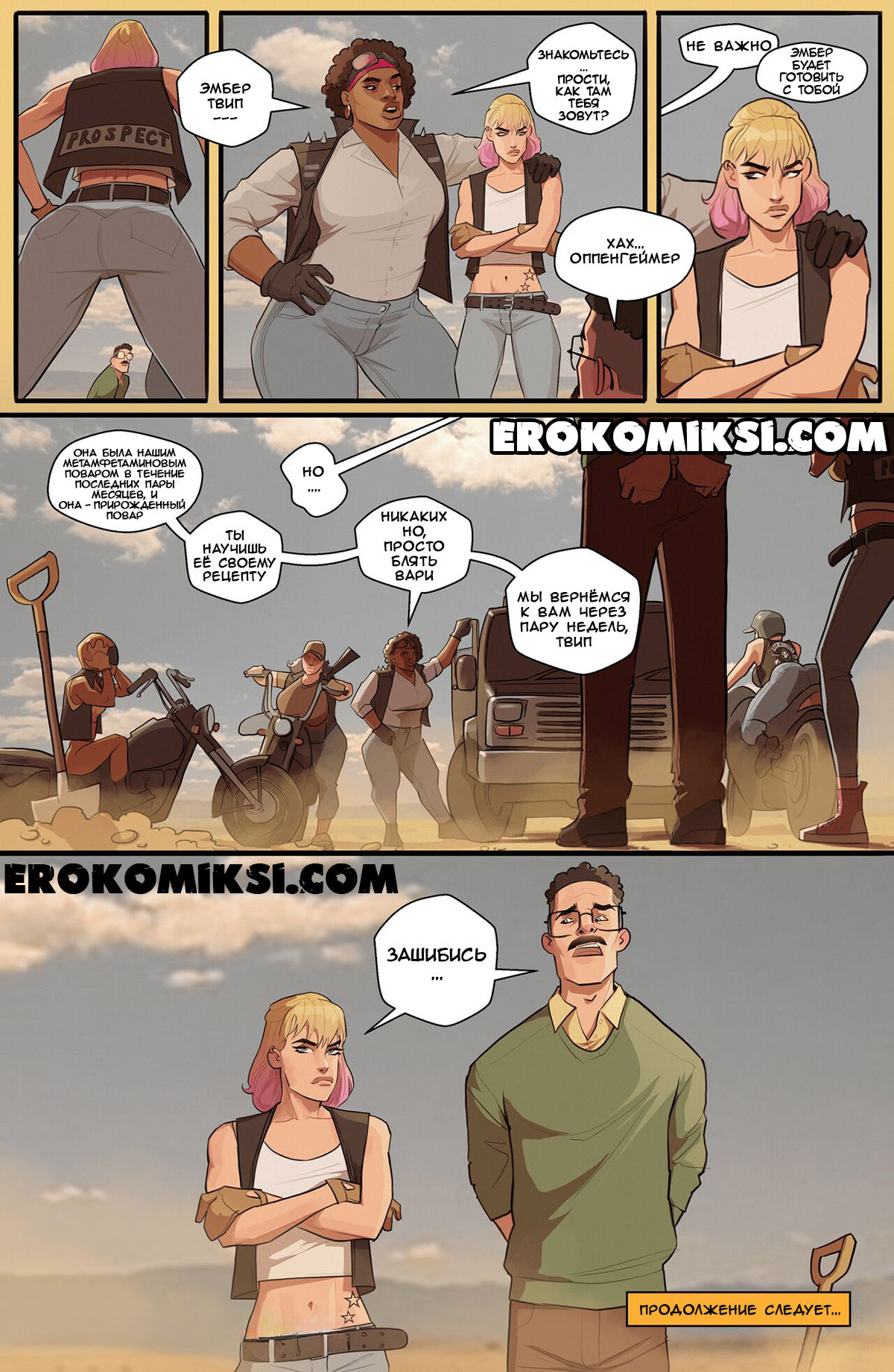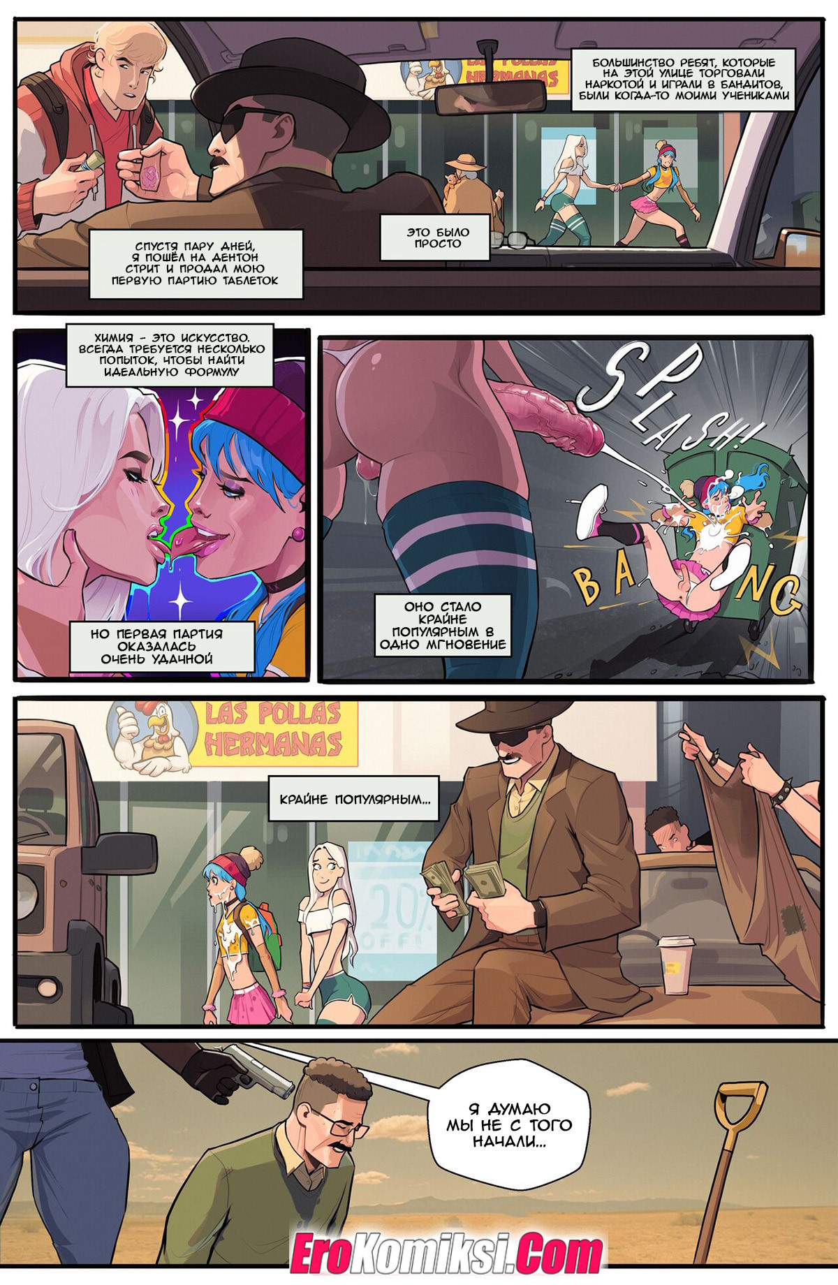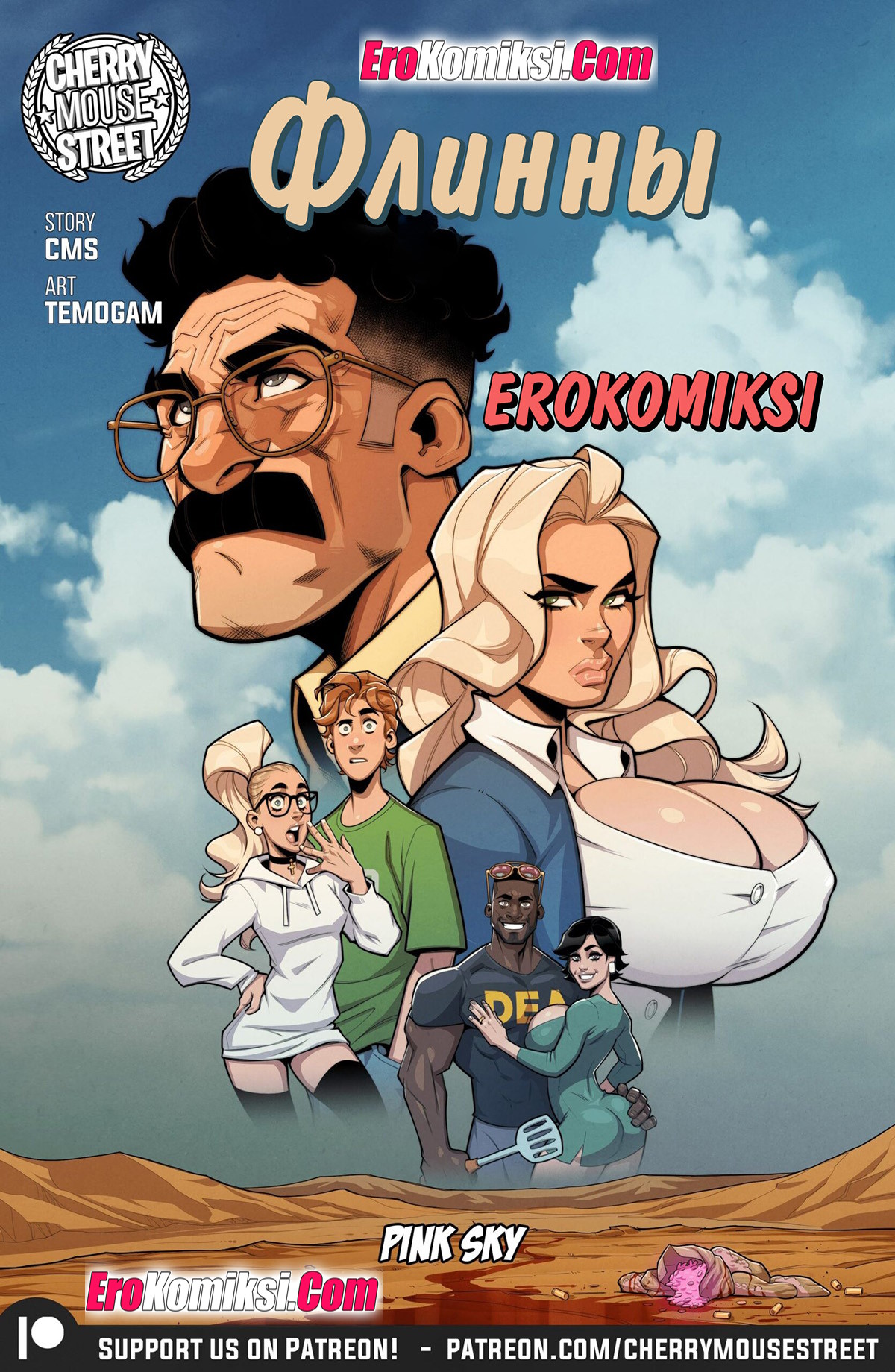 Секс комикс Флинны. Розовое небо. The Flynns. Pink Sky. Cherry Mouse Street. Пожилому мужику сообщили, что у него в головном мозге обнаружена опухоль и осталось ему жить не долго. Тогда герой решил применить свои познания в науке и приготовить виагру с метом вперемешку, чтобы убить двух зайцев разом. У него нет денег, а из-за болезни уже две недели нет и эрекции…