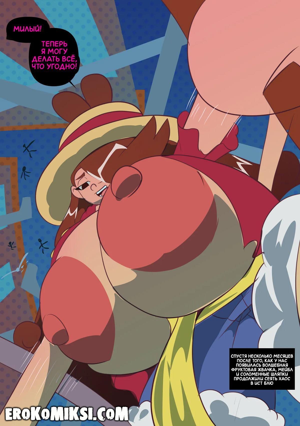 Секс комикс Гравити Фолз. Мейбл Пис. Попав во вселенную One Piece, Мейбл съела волшебную жвачку, от чего её сиськи и задница значительно увеличились в размерах, и она дико возбудилась. Рядом был Диппер, членом которого Мейбл с радостью воспользовалась и смогла удовлетворить свою похоть…