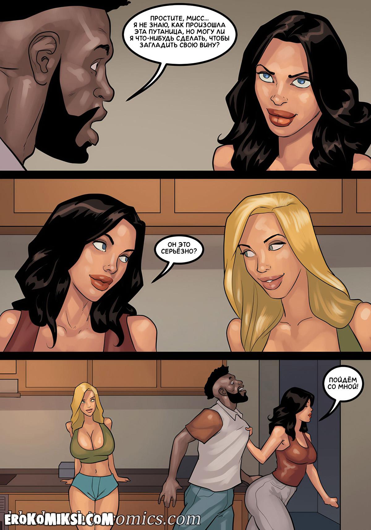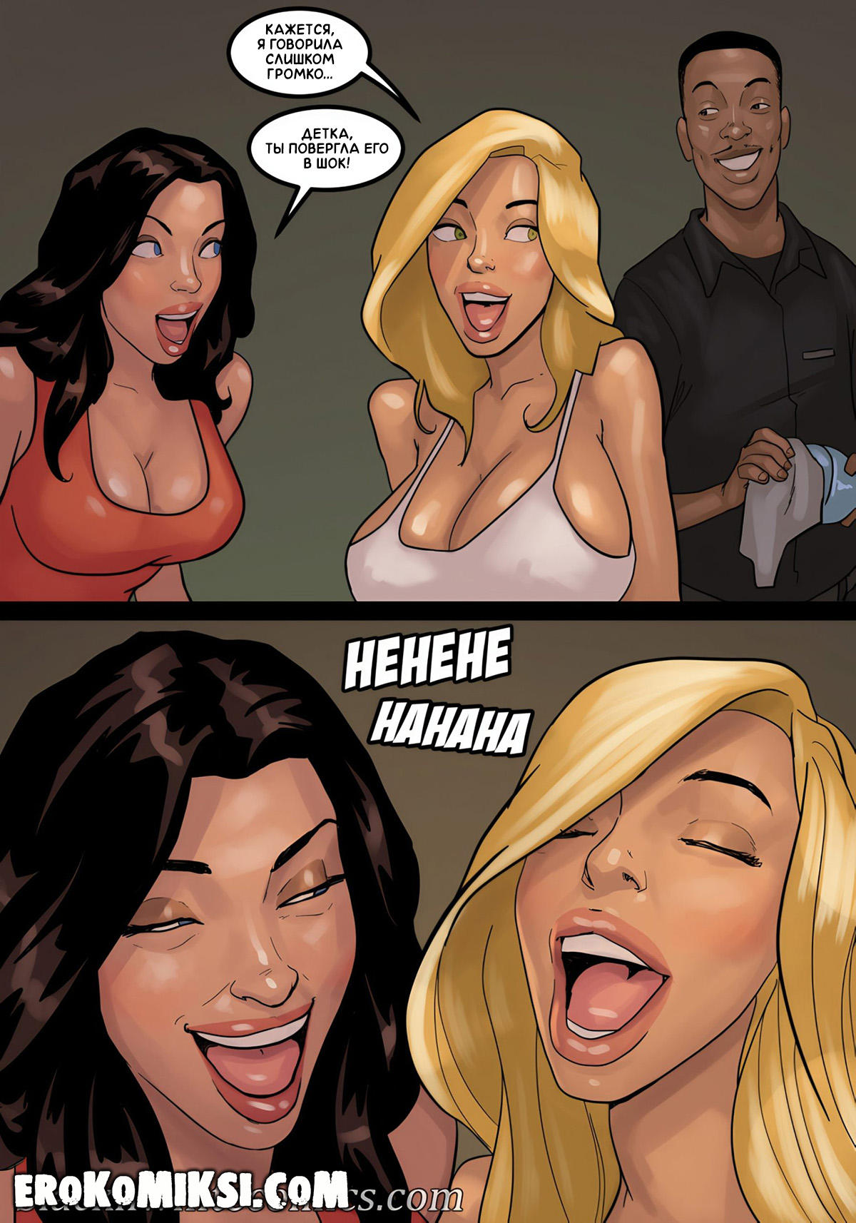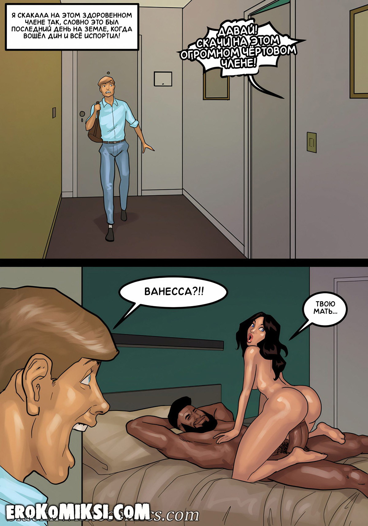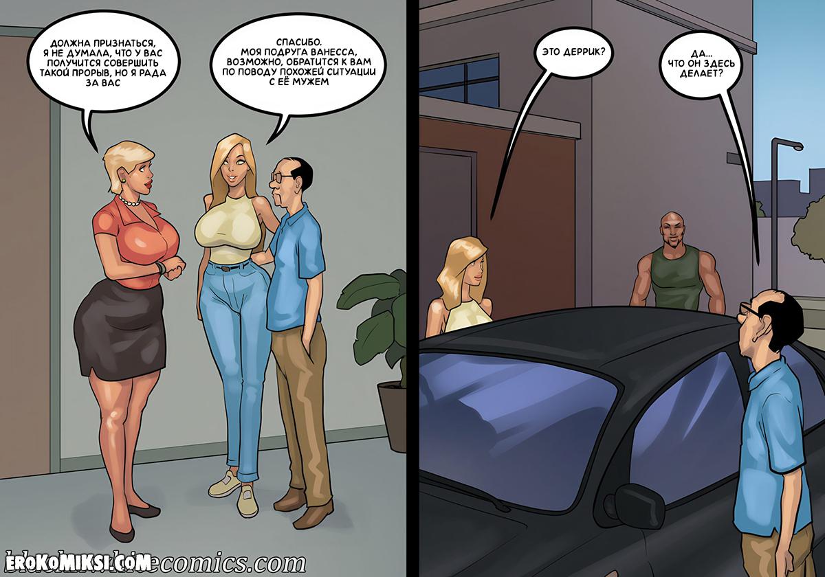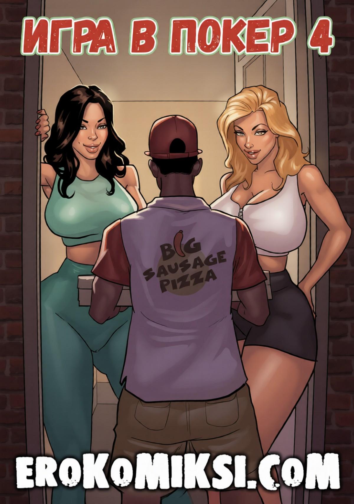 Секс комикс Игра в покер. Часть 4. Сексуальная блондинка настолько обнаглела, что на глазах у своего мужа рогоносца, затащила в дом чернокожего почтальона, чтобы тот как следует выебал её тугие дырочки, а муженёк наблюдал за всем происходящим…