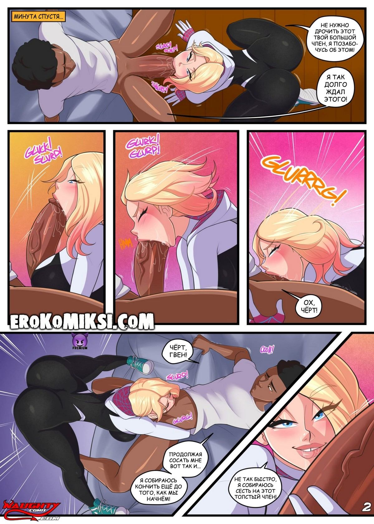 Секс комикс Извращенный Человек-паук. Гвен внезапно появилась в комнате человека-паука и застала его за дрочкой. Увидев его размер, она сразу же начала сосать его здоровый чёрный член…