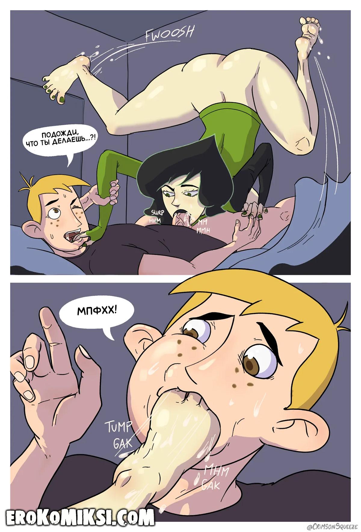 Секс комикс Ким 5+. Шиго под прикрытием. Шиго втёрлась в доверие к Рону, чтобы оказаться ближе к Ким и уничтожить её, и когда Рон был дома один, она явилась к нему и накинулась на его член, однако, Ким и Рон её рассекретили и решили использовать Шиго в своих целях…