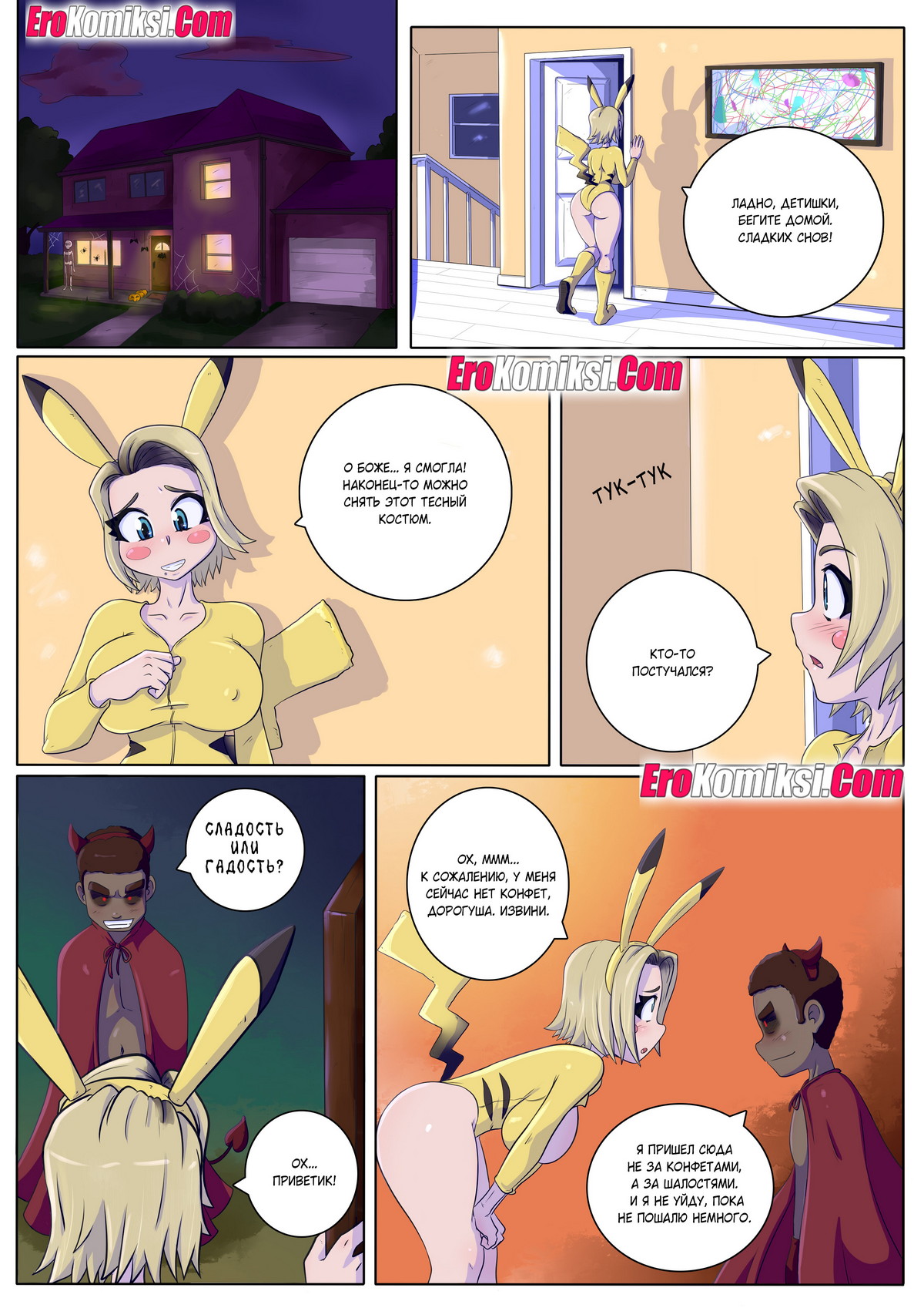 Секс комикс Косплей на ночь всех святых. На хэллоуин сочная Чика встречала гостей в костюме Пикачу. И можно сказать — это был обычный праздничный день всех святых, но ночью к её дому пришел сам похотливый «Дьяволенок». Он проник в её дом и жадно трахнул бедную женщину…