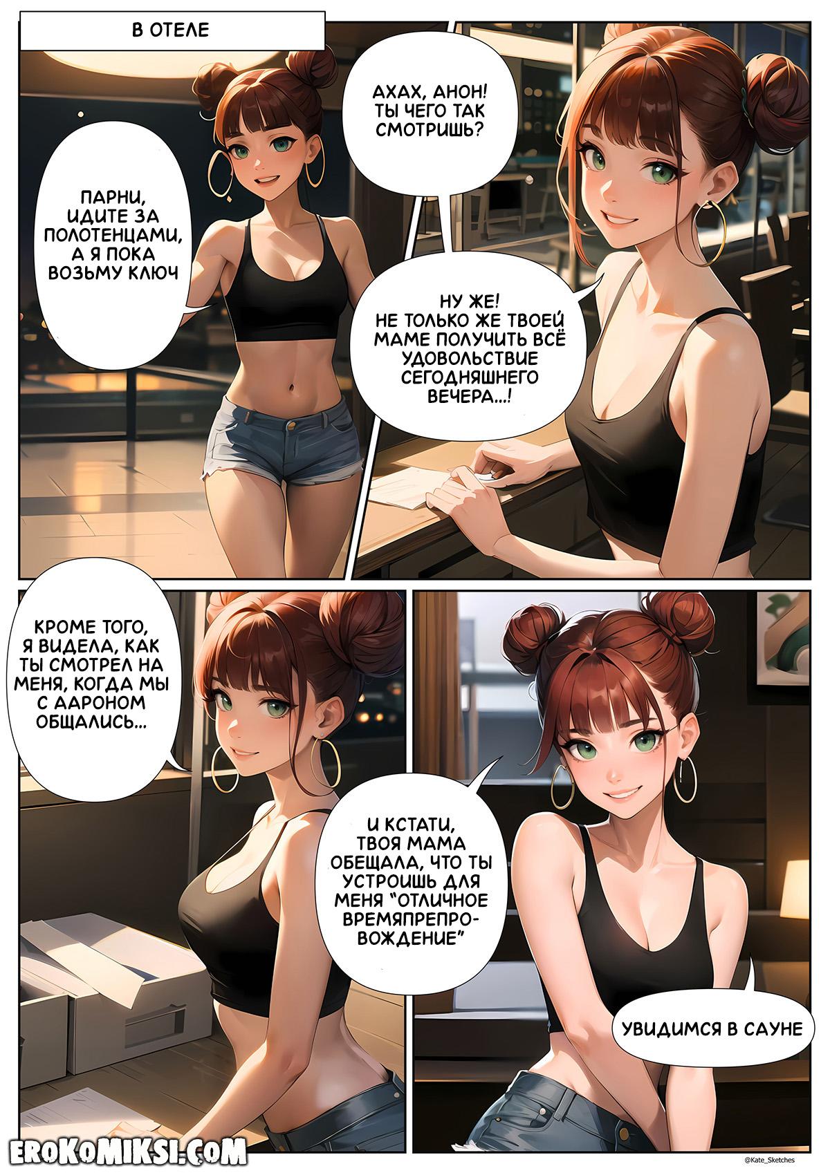 Секс комикс Летние каникулы Анона. Часть 3. Эпизод 2. Анон, Аарон и Лейси идут в сауну, где Лейси даёт парням как следует оттрахать себя и обкончать своё милое личико. После сауны, Аарон встречает в холле отеля сильно подвыпившую мисс Эрикссон, которая просит его проводить её в номер и уложить спать.