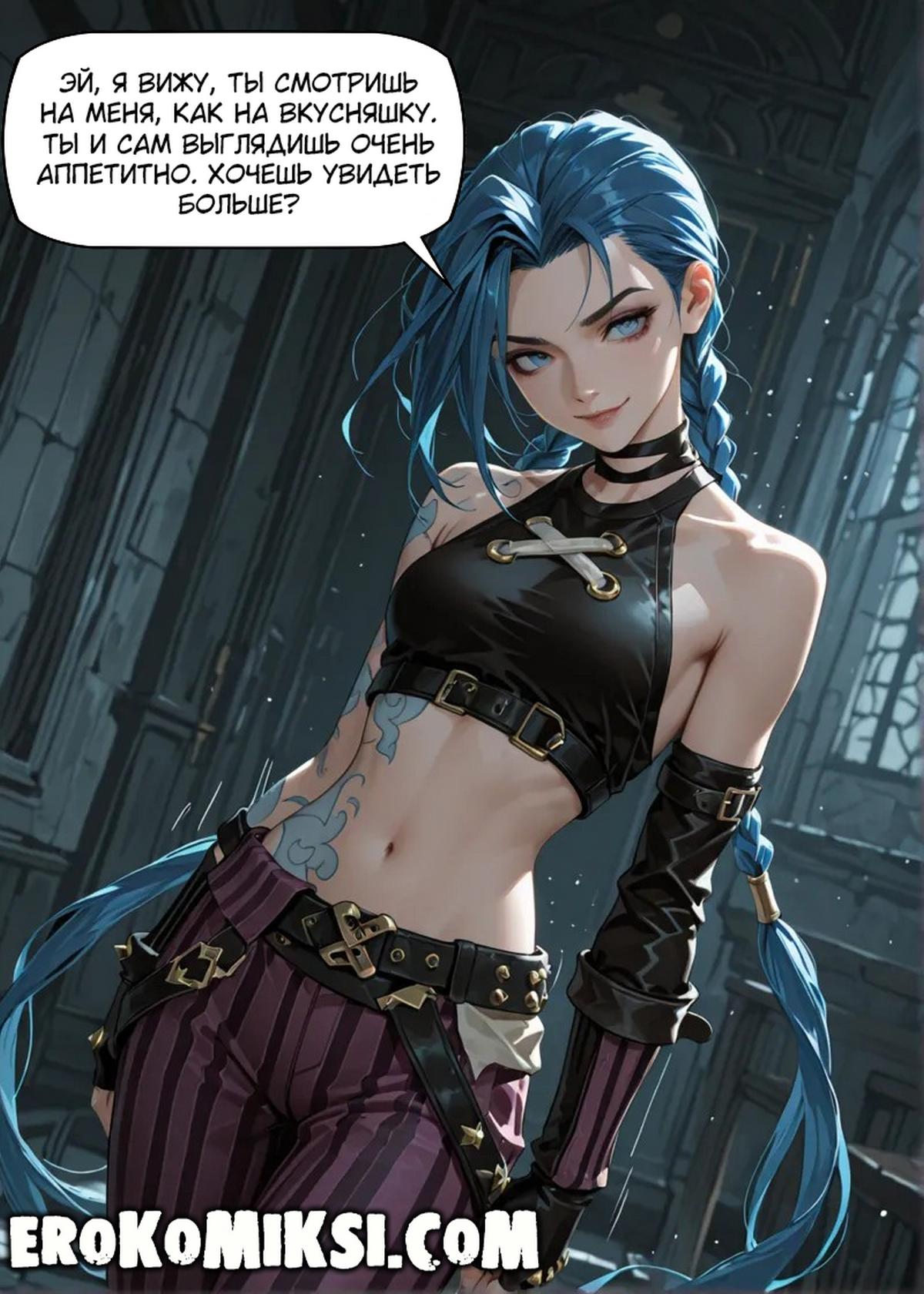 Секс комикс Лига Легенд. Джинкс притащила парня домой. Jinx takes a guy home. Возбужденная Джинкс решила пошалить со своим дружком и разделась перед ним, показав во всей красе свои аппетитные формы. Красотка отсосала член парня, после чего раздвинула ножки и дала ему себя хорошенько трахнуть и заполнить ее тугие дырочки спермой…