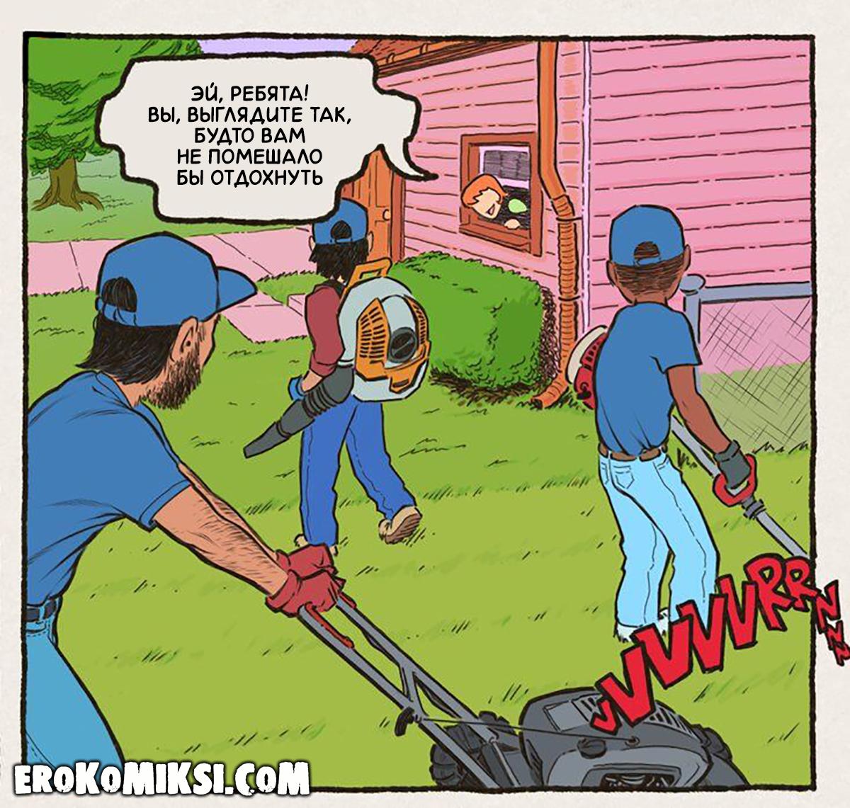 Порно комикс Мама Декстера. Перерыв на Секс. Мама Декстера выполнила все свои домашние обязанности и думала чем бы заняться, так как до вечера она была дома совсем одна. За окном трудились садовники и мамашка предложила им сделать небольшой перерыв и пригласила к себе. Как только садовники зашли к ней в дом, она сразу же сбросила с себя одежду и начала сосать их члены, а затем дала выебать себя в три ствола…
