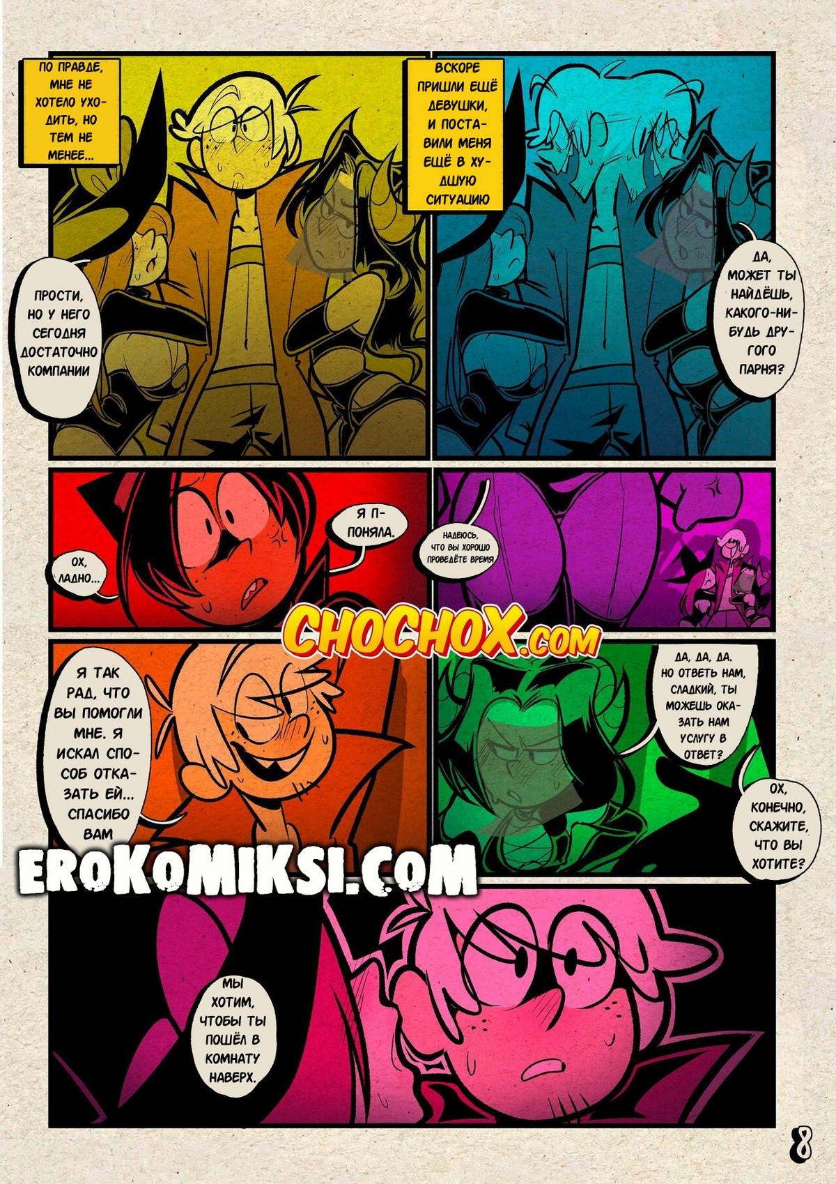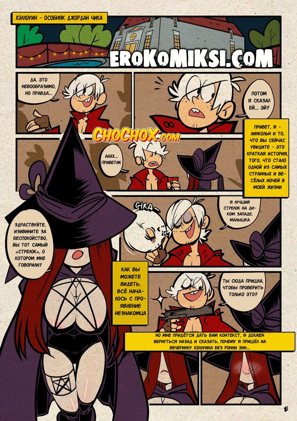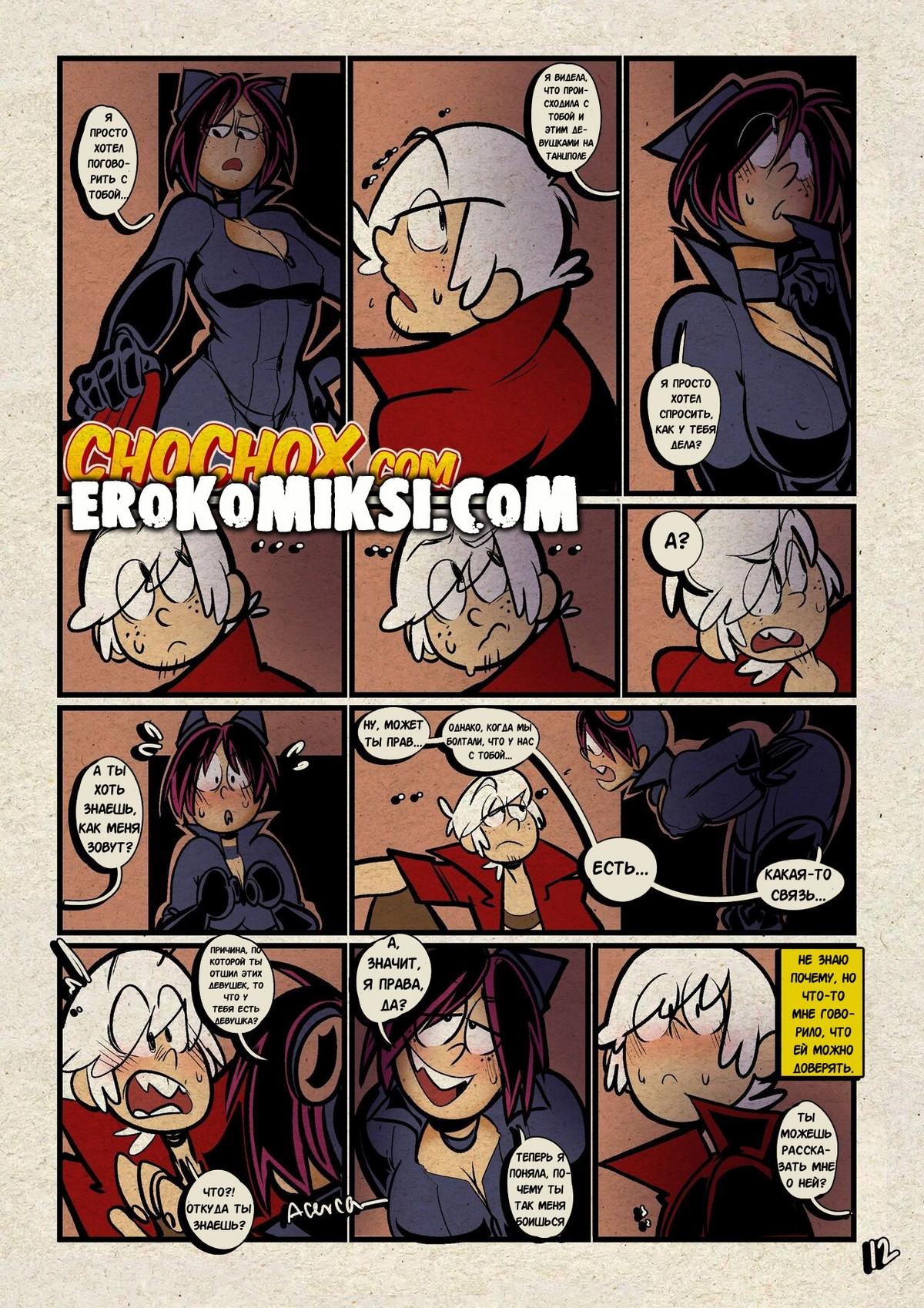 Секс комикс Мой шумный дом. Хитрый трюк. Ронни решила проверить верность своего парня Линкольна и отправила его одного на вечирку в честь Хэллуина. Линкольн очень сильно сопротивлялся, когда к нему начали приставать две горячие красотки, которые не хотели отпускать его, пока он их не трахнет…