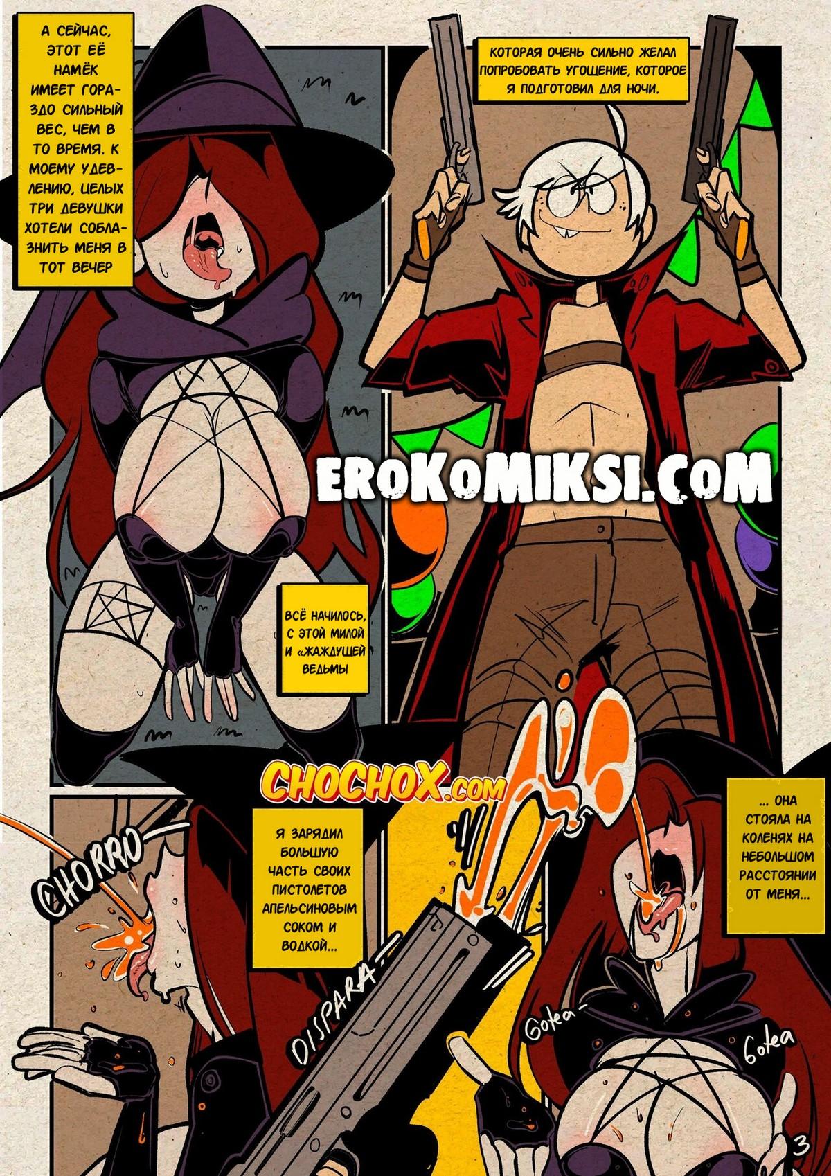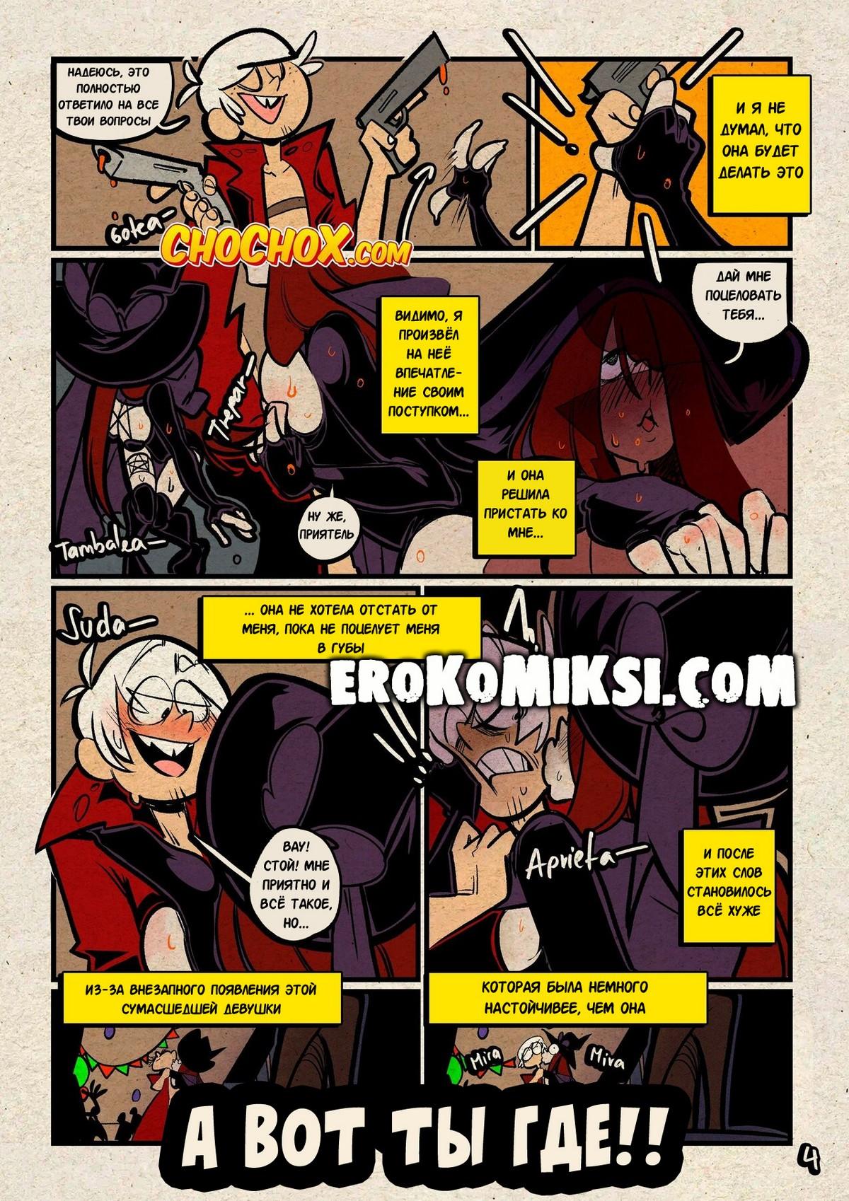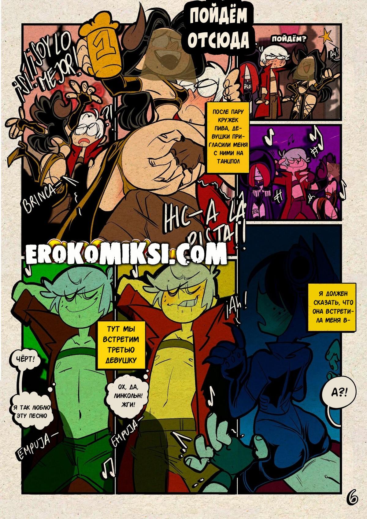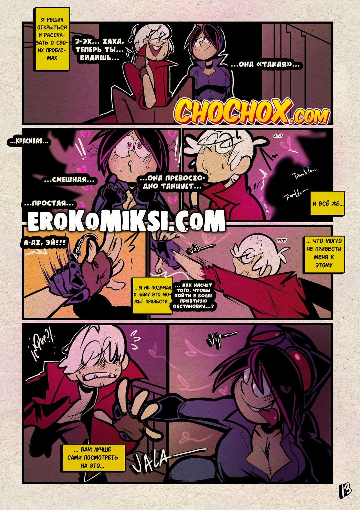 Секс комикс Мой шумный дом. Хитрый трюк. Ронни решила проверить верность своего парня Линкольна и отправила его одного на вечирку в честь Хэллуина. Линкольн очень сильно сопротивлялся, когда к нему начали приставать две горячие красотки, которые не хотели отпускать его, пока он их не трахнет…