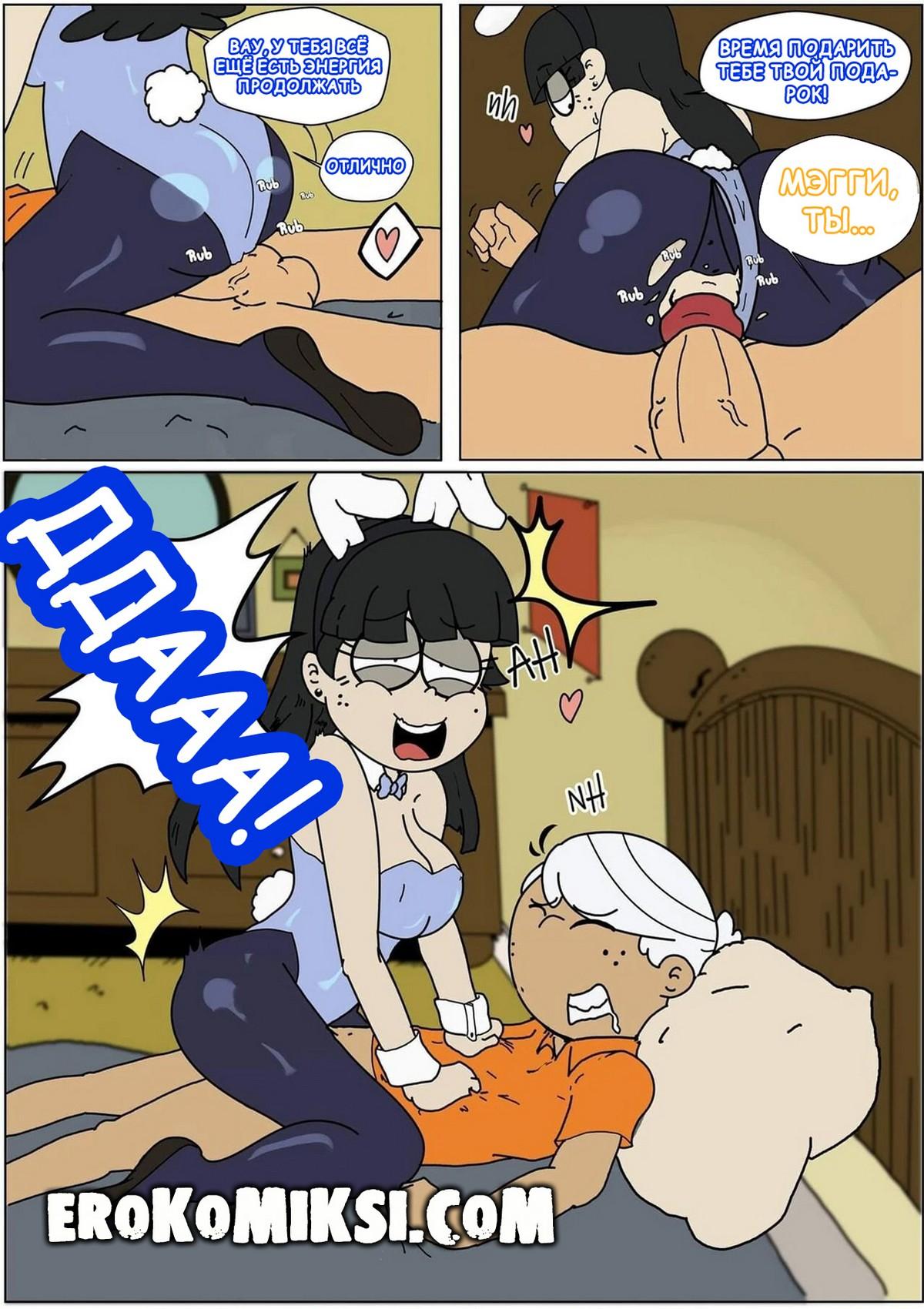 Секс комикс Мой Шумный Дом. Кролик. Линкольн нашёл очень странную записку, в которой было написано, что его подарок в его комнате. Оказывается Мэгги переоделась в сексуальный костюм кролика, чтобы соблазнить и потрахаться с Линкольном…