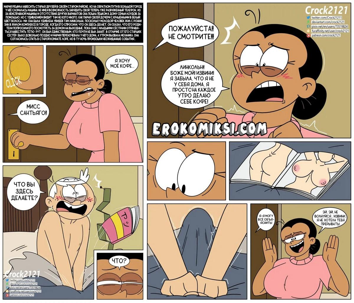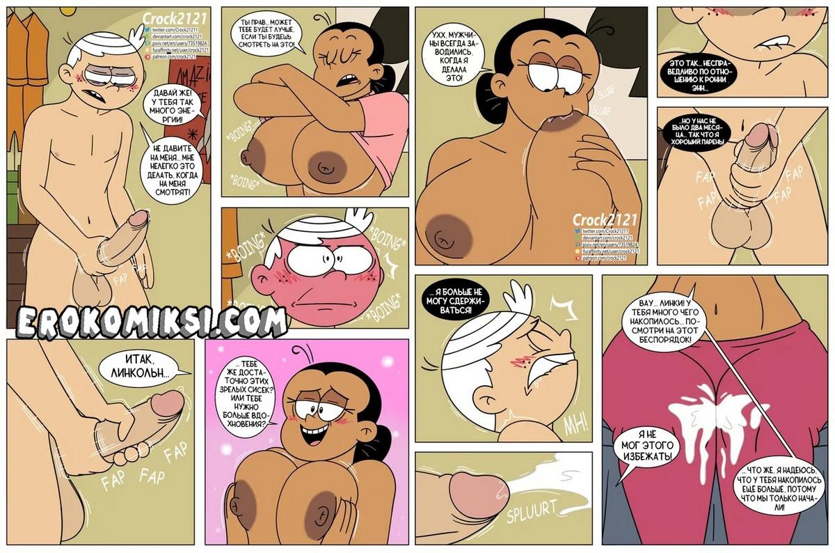 Секс комикс Мой шумный дом. Правила для взрослых. Линкольн был у себя в комнате и занимался мастурбации, когда в его комнату зашла милфа Мария. Линкольн не сдержался и рассказал, что дочь Марии не даёт ему уже несколько месяцев. Похотливая милфа так сильно возбудилась, когда увидела огромный член Линкольна, что совсем была не против помочь ему с этим…