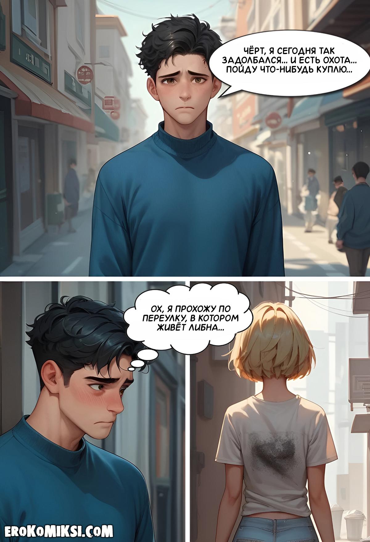 Секс комикс Моя бездомная подружка. Возвращаясь домой, Роман увидел бездомную девчонку Либну, и ему стало её жалко, поэтому, он пригласил её к себе домой, и накормил. Либна решила отблагодарить Романа, и отсосала его огромный член, и дала выебать свою киску…