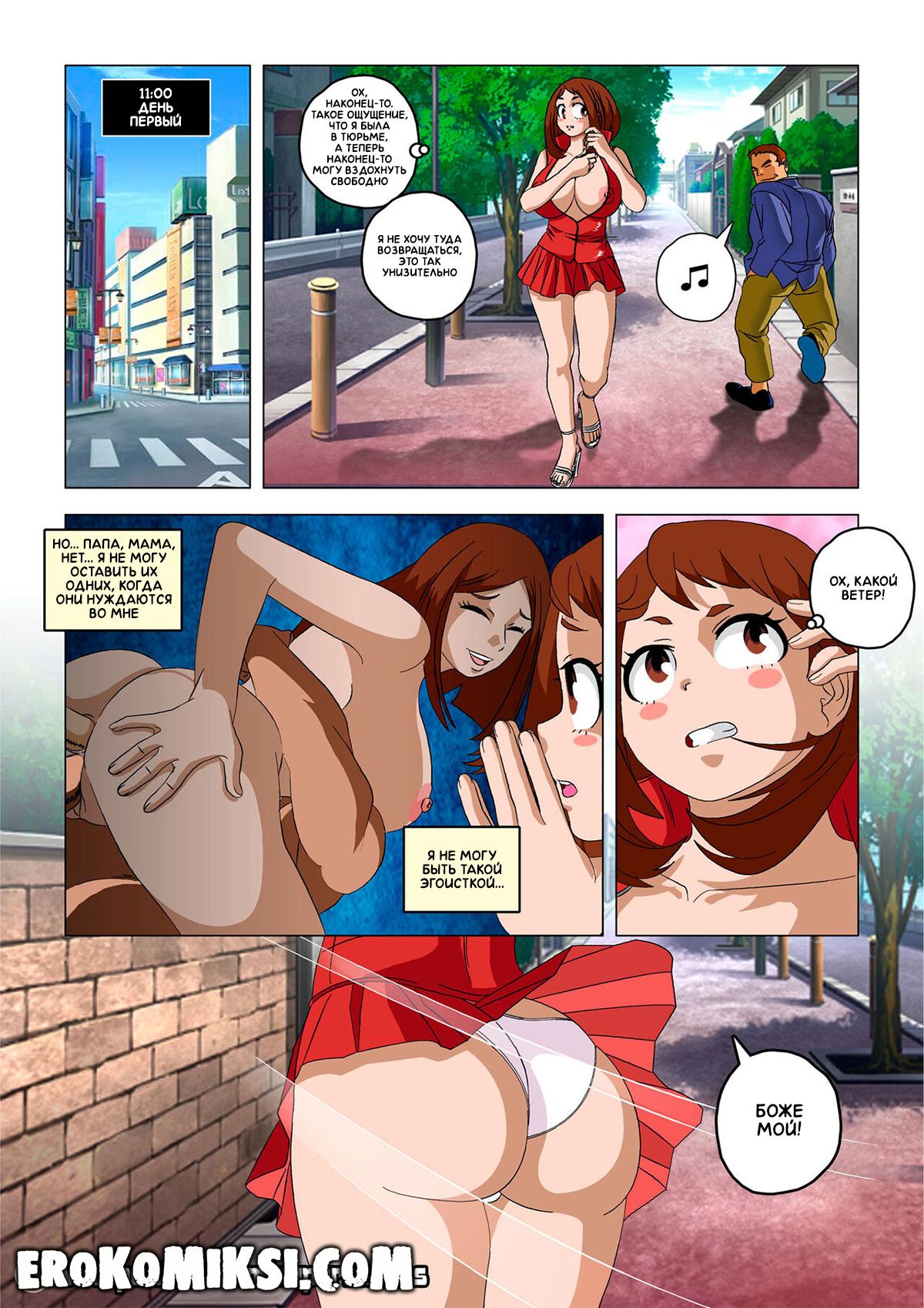 Секс комикс Моя геройская академия. Возвращение в Ад. История продолжается. Урарака просыпается в непонятном особняке и ничего не помнит. Небольшие вспышки памяти, наводят её на осознание того, что вчера она ублажала кучу мужчин на видеокамеру. Пребывая в шоковом состоянии, Урарака пытается сбежать из этого особняка, но встречает Момо, которая объясняет ей, что сбежать не удастся и пора готовиться к очередной съёмке. Урарака понимает, что попала в ад…