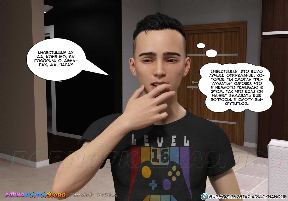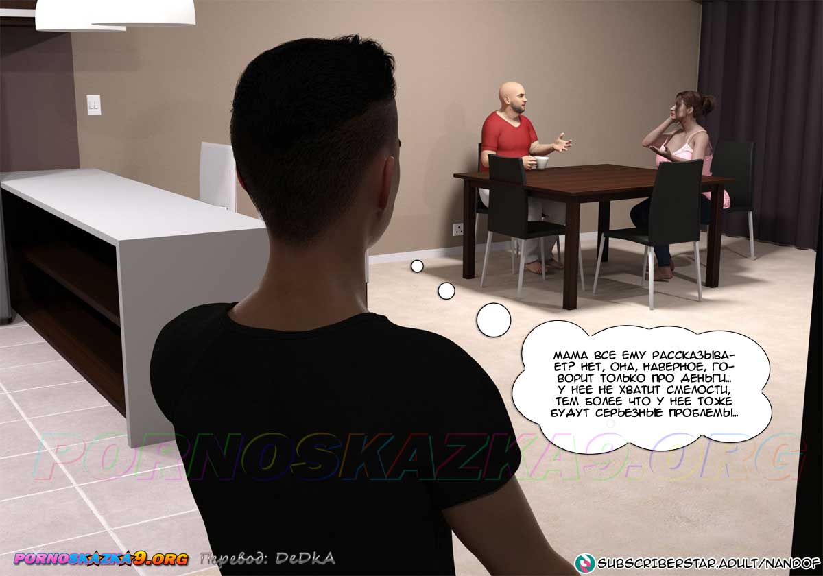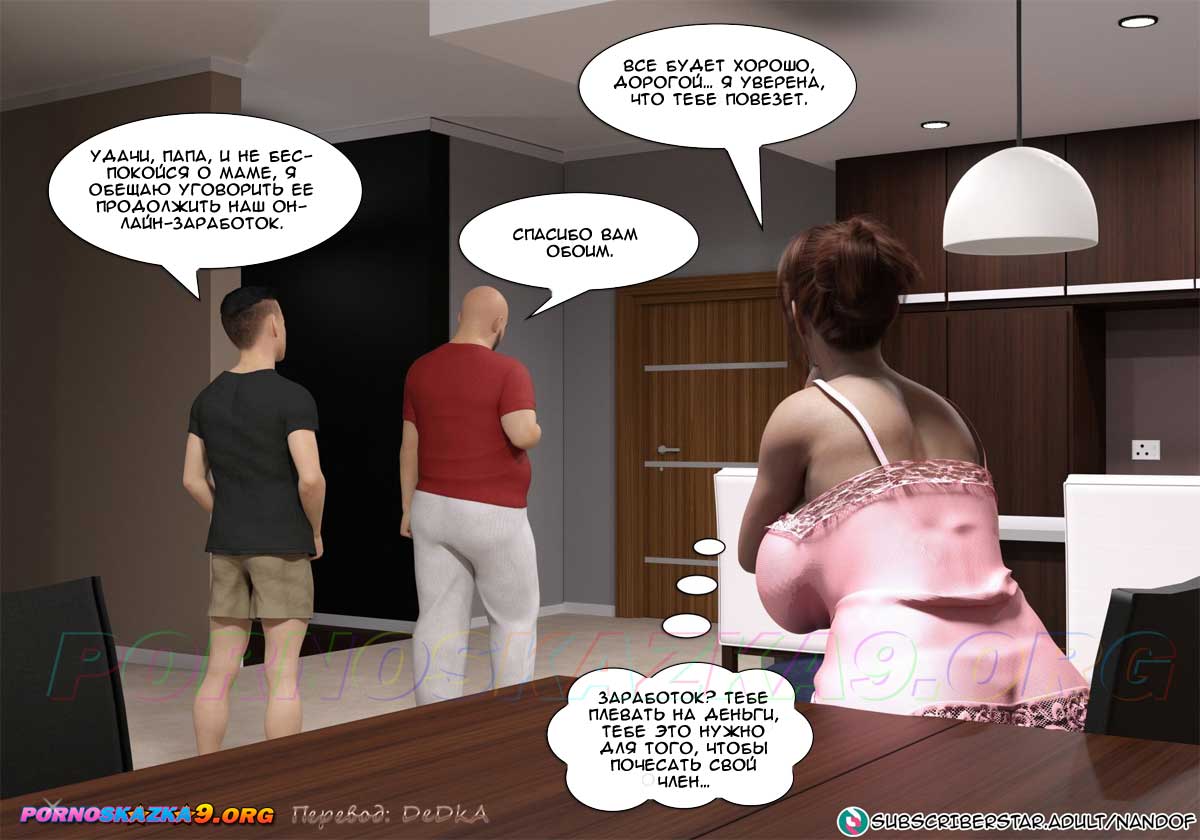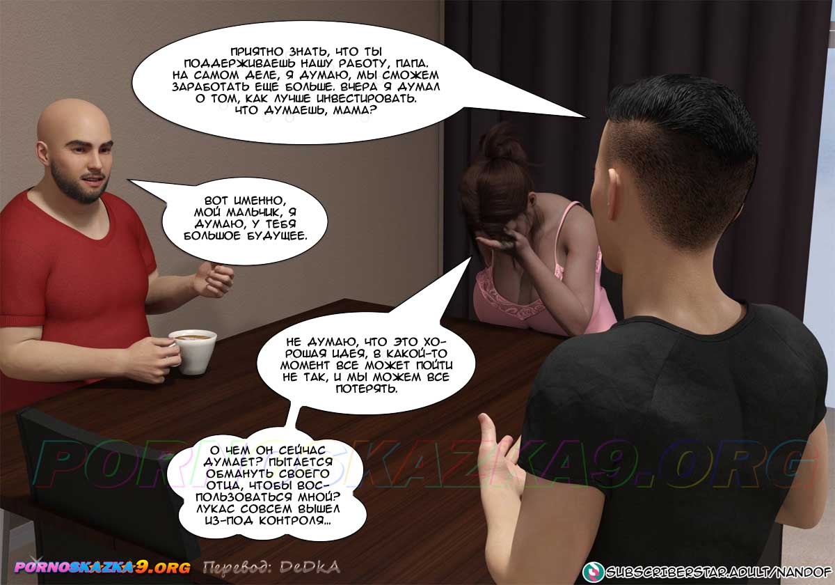 Секс комикс Моя мама порнозвезда. Часть 6. Глория сказала мужу, что с помощью Лукаса ей яко бы удалось сделать онлайн-инвестицию и получить доход, достаточный для того, чтобы оплатить долги по ипотеке, но так как это рискованный бизнес, она не намерена продолжать. Но муж, который сейчас не имеет работы, попросил ее подумать о том, чтобы продолжить это дело… Знал бы он в чем заключается эта совместная работа его жены и сына…