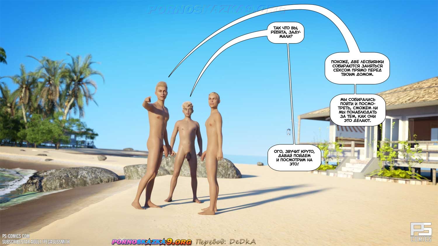 Секс комикс Нагишом. Нудистский курорт. Часть 19. Пока Брэнди и Келли, благодаря мудрым островитянкам, находятся в процессе активного примирения, Дилан внимательно наблюдает за тем, как это происходит, и испытывает острое желание присоединиться, так сказать, стать третьим, но не лишним, однако, сейчас этого не случится, это будет позже…