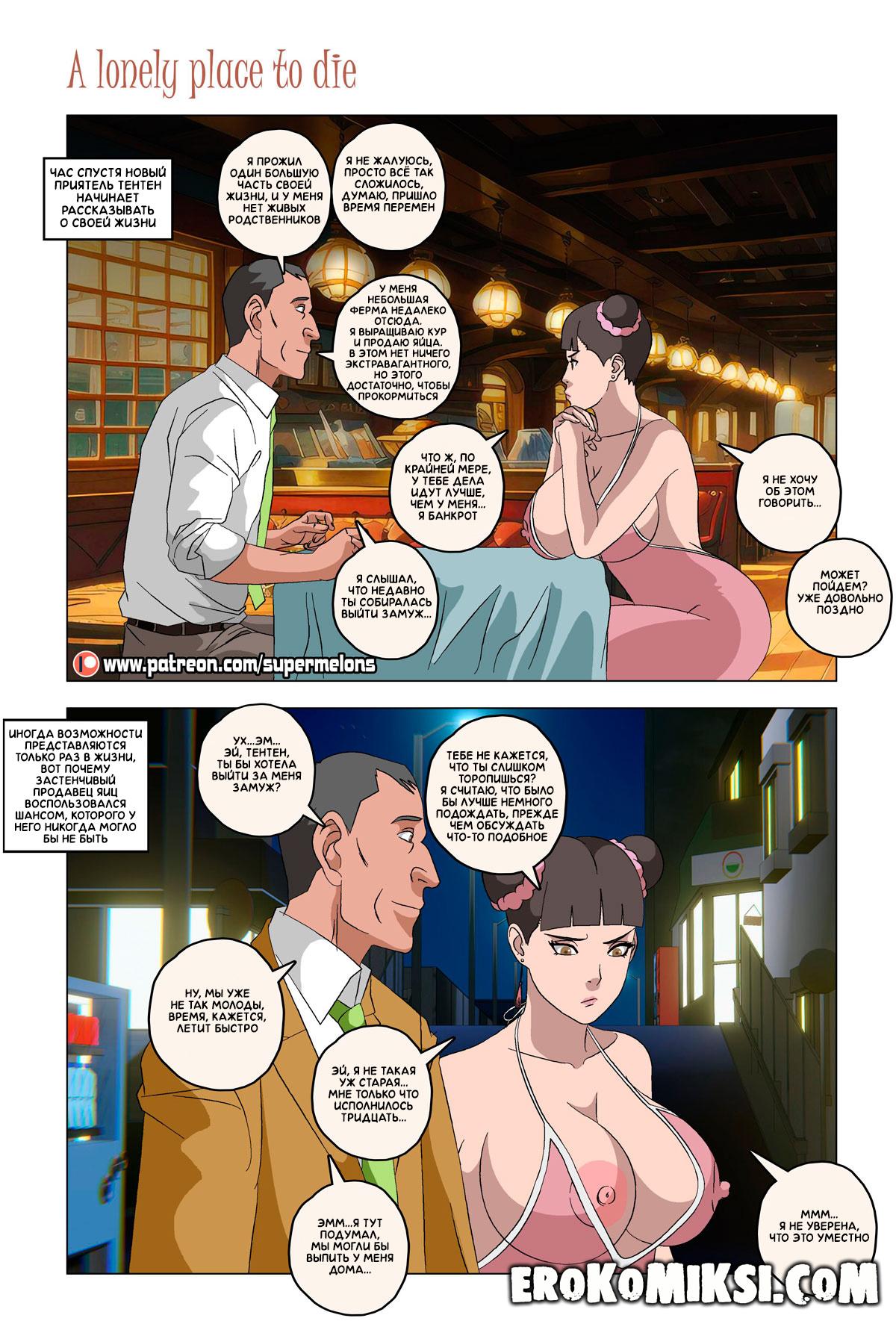 Секс комикс Наруто. Безлюдное место, где можно умереть. Красавица Тентен владеет своим собственным оружейным магазинчиком, но продажи очень низки, так как на дворе мир и поэтому, Тентен целыми днями сидит и мечтает о своей личной жизни и своём идеальном муже. Однако, к Тентен сватаются лишь стрёмные мужики, среди которых был и скромный фермер. Придя в очередной раз в магазин к Тентен, фермер предложил ей выйти за него замуж и Тентен согласилась…