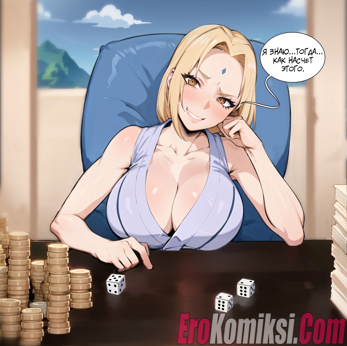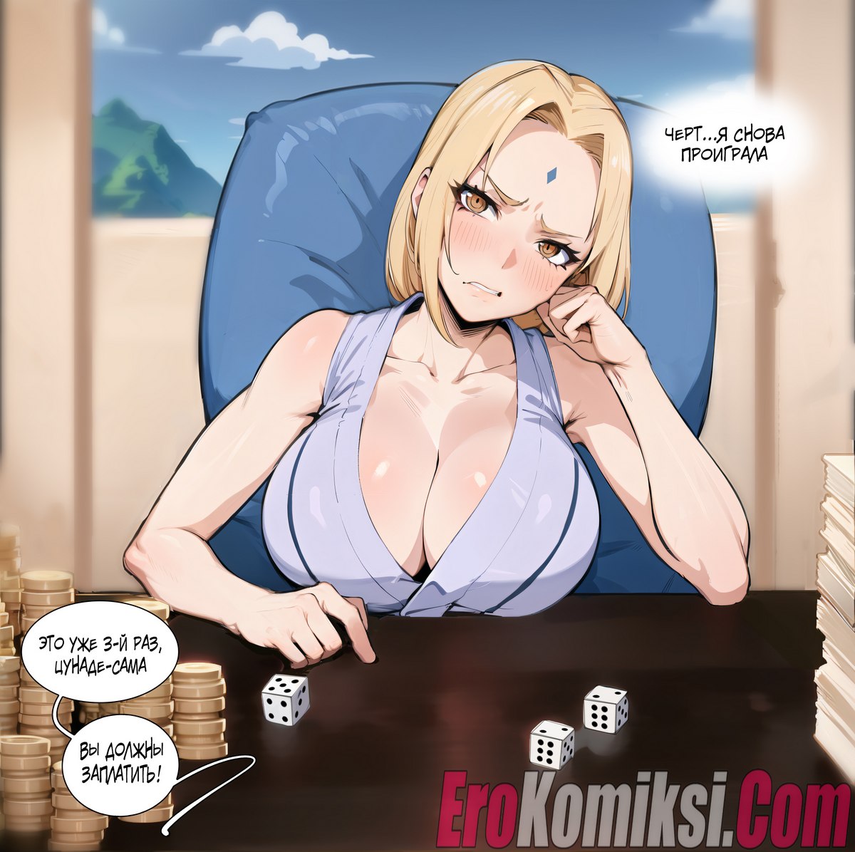 Секс комикс Наруто. Игра в кости с Цунаде. Похотливая Цунаде не рассчитала сил, и в «хлам» проигралась. Но в руках Цунаде есть большой козырь — это пышная грудь и узкая вагина, позволяющая получать огромное удовольствие…