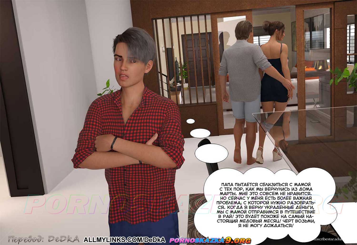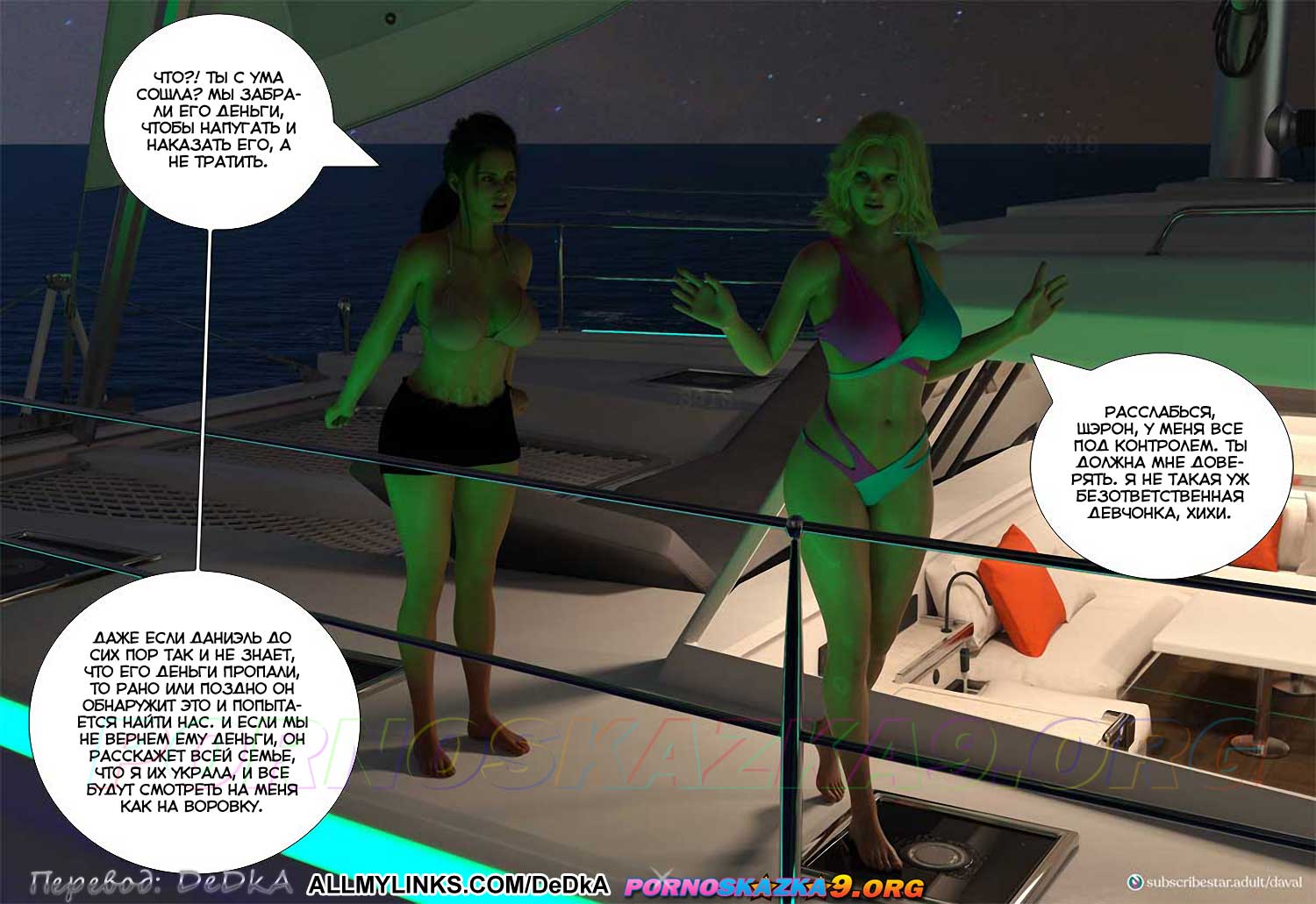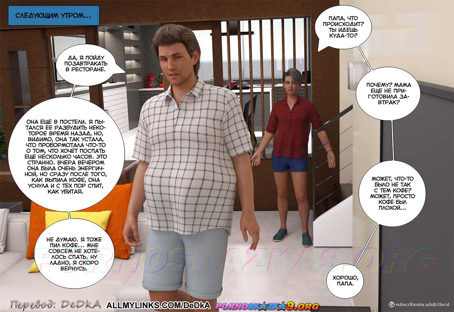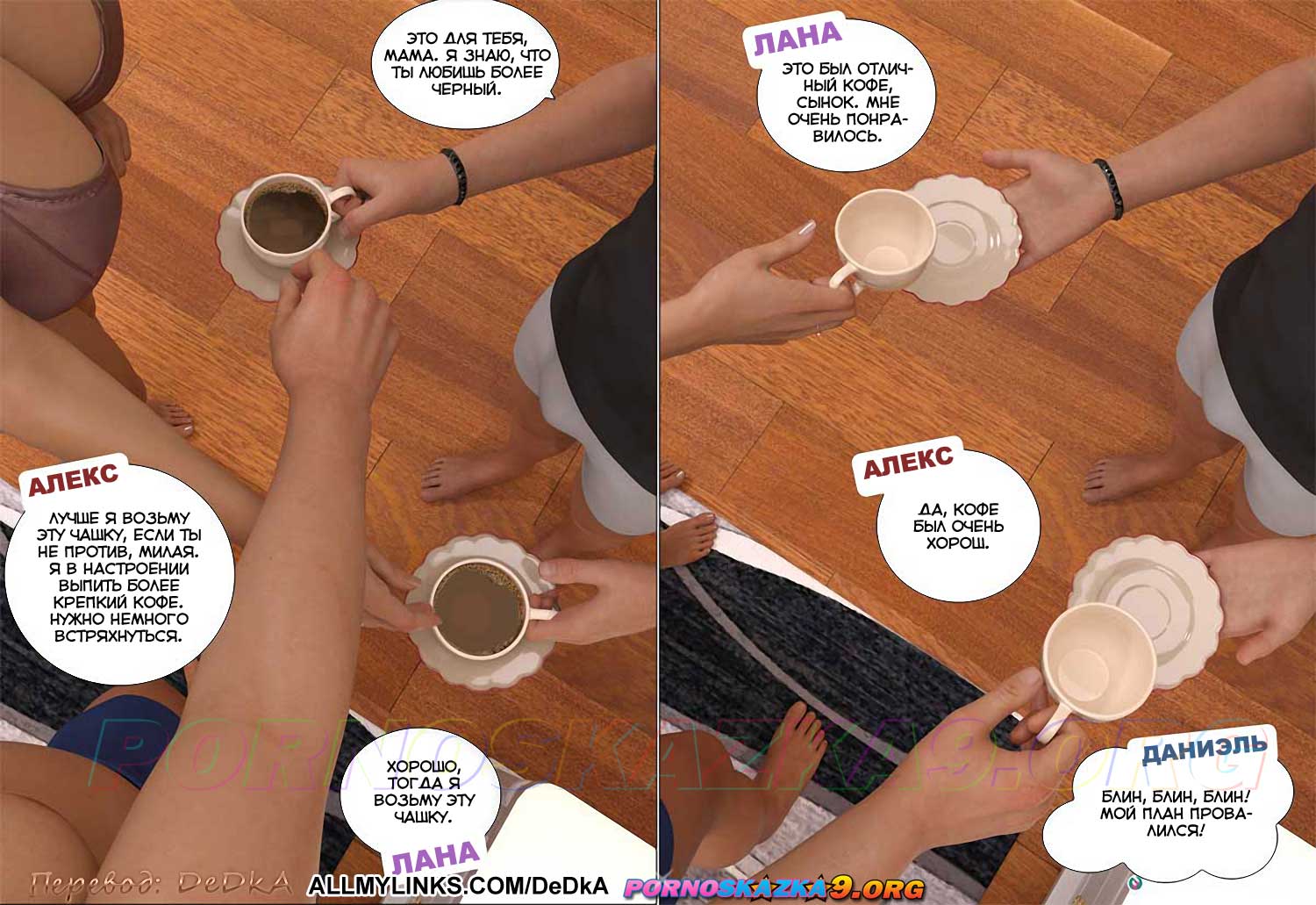 Секс комикс Непристойные желания мамаш. Часть 12. Семейка вернулась домой после выходных проведенных в гостях. Даниэль и Алекс вернулись не с пустыми руками. Алекс привез с собой таблетку, которая должна помочь ему быть на высоте в постели с Ланой, а Даниэль привез с собой таблетку снотворного, которую он решил бросить в кофе Алекса, чтобы он уснул. Чья таблетка окажется круче?